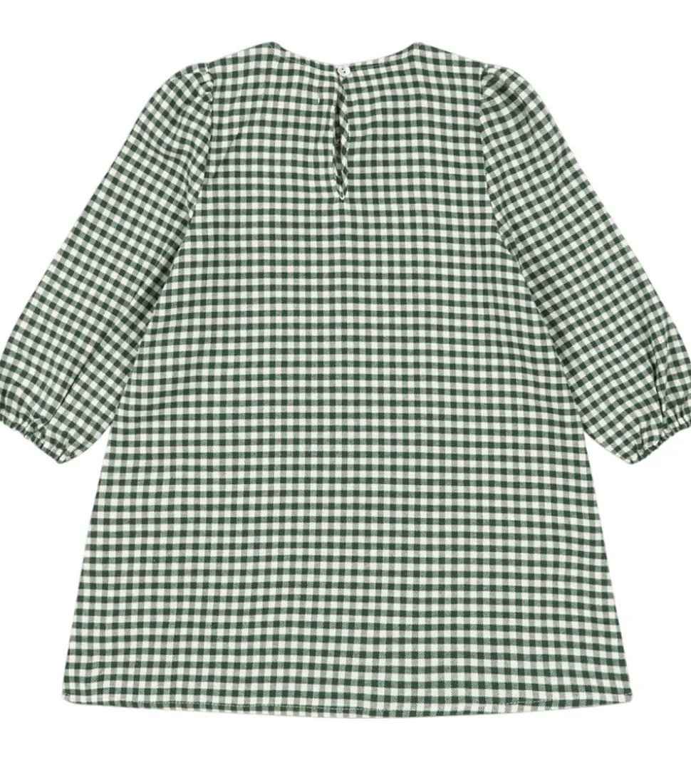Stilfuld kjole fra Konges Sløjd med et ternet mønster i hvid og grøn. Konges Sløjd kjolen har lange ærmer med smalle elastikkanter, og den har et flot A-snit. Kjolen lukkes i nakken meden knap, og den er lavet i en let, fastvævet kvalitet.