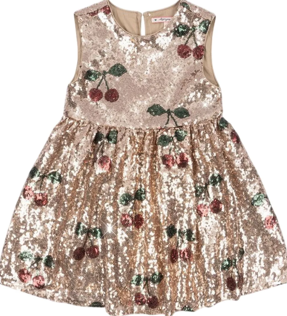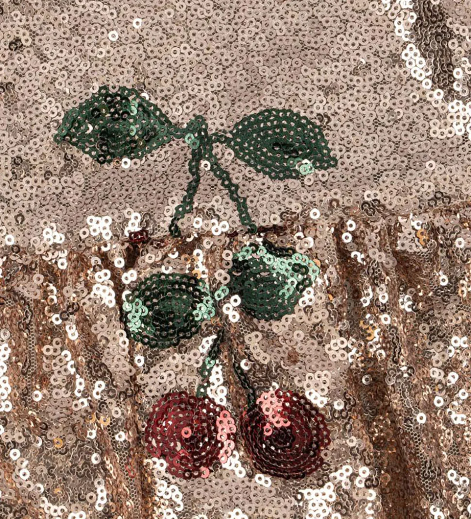 Fortryllende Konges Sløjd kjole med et strålende pailletdesign i rosa. Kjolen har et smukt kirsebærmønster i røde og grønne nuancer, der komplimenterer den gyldne baggrund. Konges Sløjds kjole har en ærmeløs struktur med rund halsudskæring.