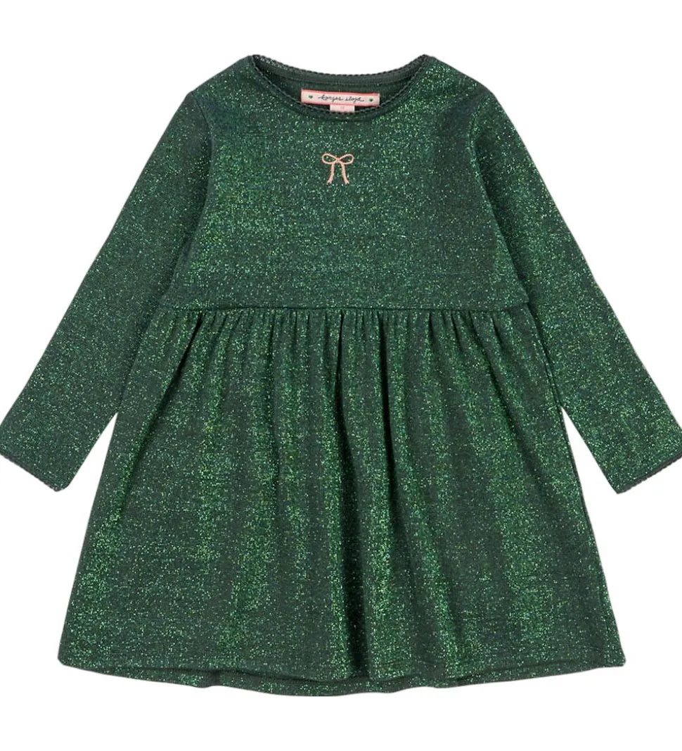 Smart Konges Sløjd kjole i mørkegrøn med glimmer, og den er lavet i en strækbar kvalitet. Kjolen fra Konges Sløjd har lange ærmer og en rund halsudskæring. Der er en diskret broderet detalje på brystet, som tilføjer et ekstra pift til designet. Kjolen har en god vidde med en løs pasform.