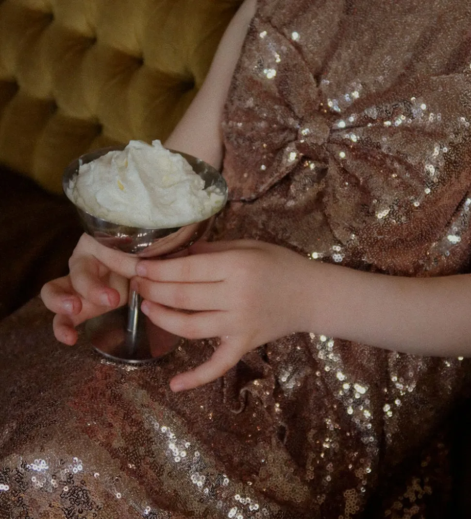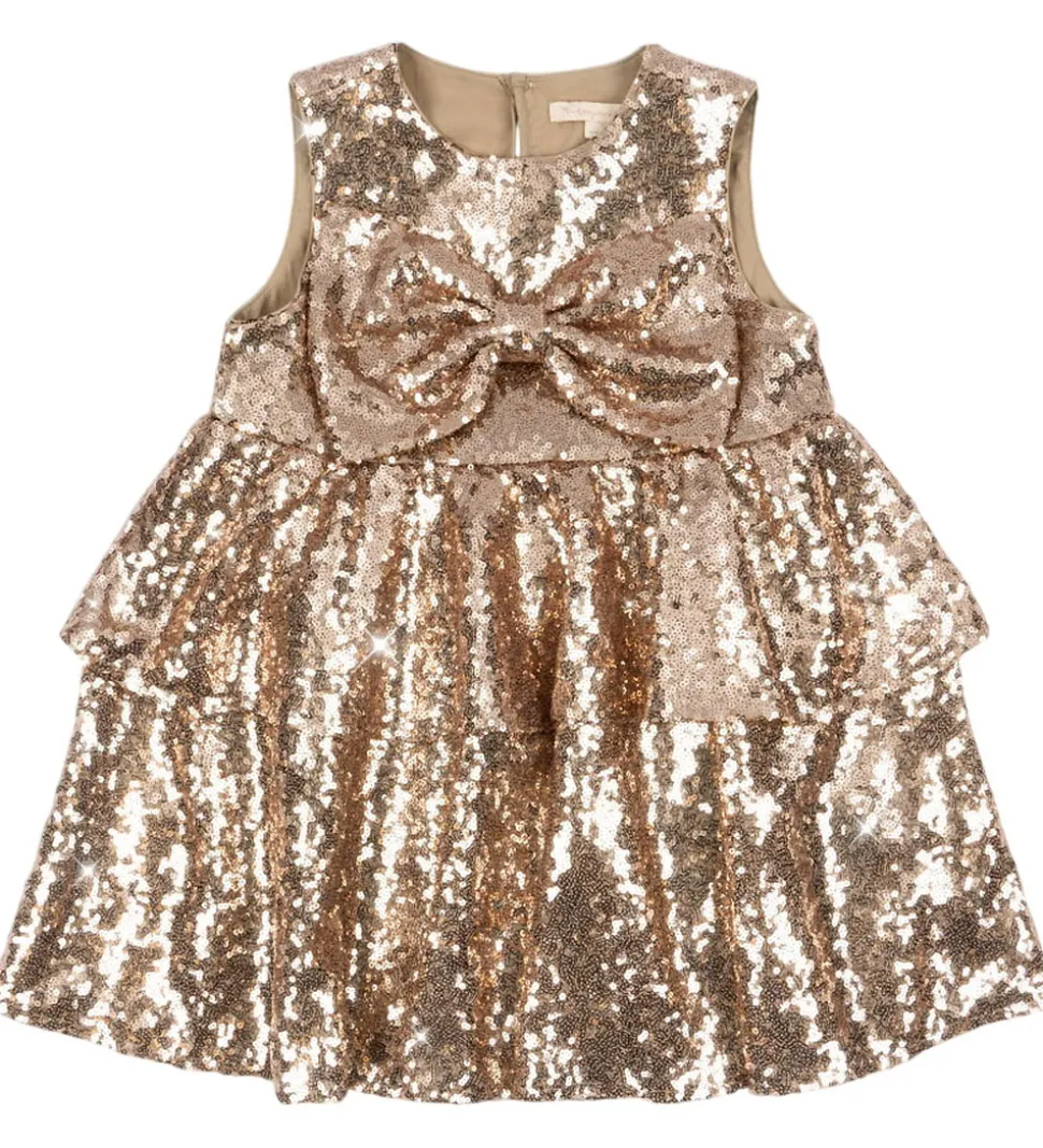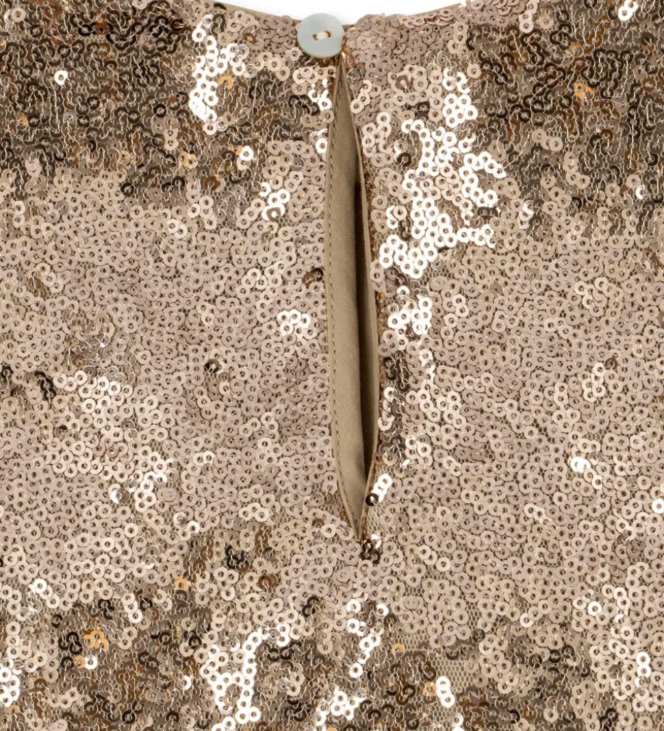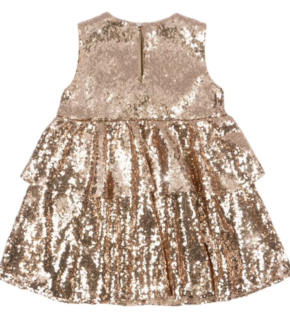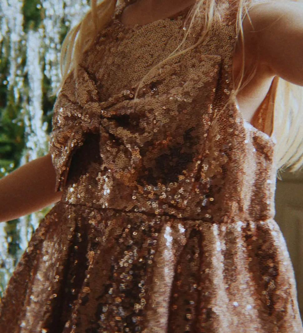 Fin Konges Sløjd kjole med rosa pailletter med et metallisk skær. Kjolen er helt uden ærmer, og fortil sidder der en stor sløjfe. Nedenunder falder skørtet med masser af vidde og i forskuldte lag. Kjolen lukkes i nakken med en knap. Kjolen har et ekstra lag af bomuld på indersiden.
