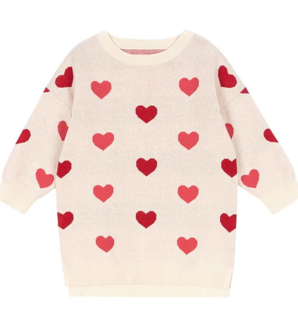 Skøn kjole fra Konges Sløjd strikket i lysebeige med et charmerende hjerteprint i rosa og røde nuancer. Den afslappede pasform gør den behagelig at bære, mens de lange ærmer tilføjer et ekstra lag af varme. Ribkanter ved hals, ærmer og bund fuldender det stilrene design fra Konges Sløjd.