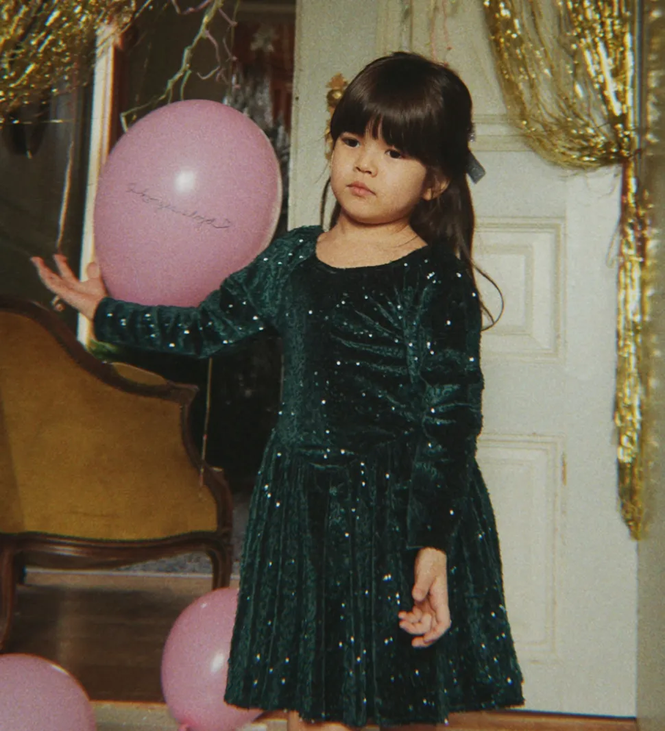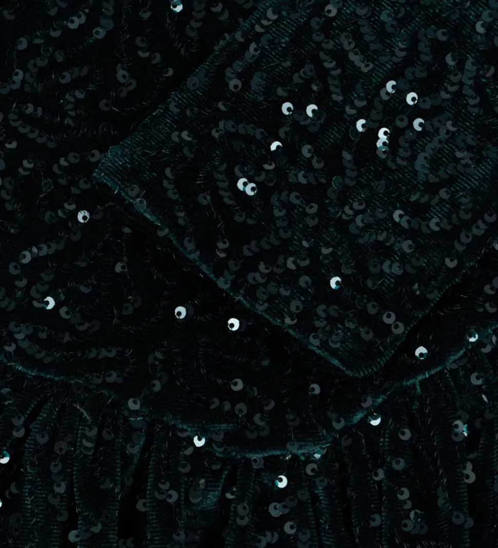 Imponerende Konges Sløjd kjole med lange ærmer. Kjolen er prydet med glitrende pailletter i en dyb, grøn nuance og har en lækker velour-struktur. Konges Sløjd kjolen har en elegant, let V-udskæring og let rynket skørt.