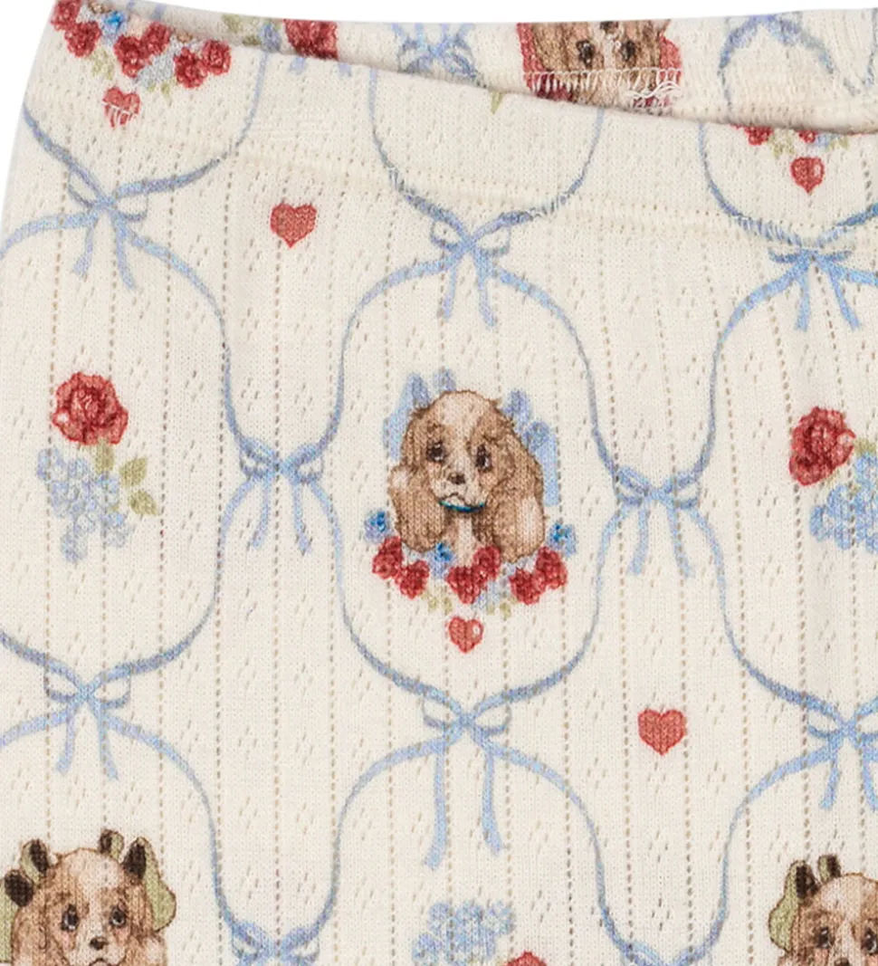 Charmerende Konges Sløjd leggings i lysebeige med et sødt print af små hunde og blomster i røde og blå nuancer. Konges Sløjd leggingsene har en ribbet struktur og en elastisk talje for god pasform.