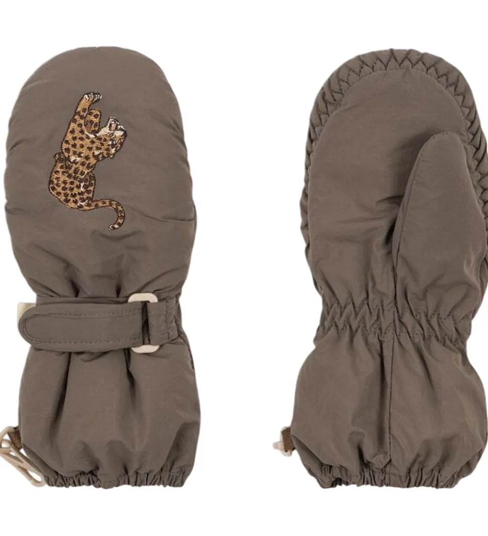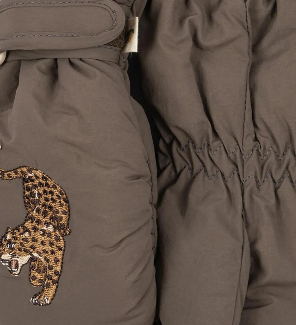 Lækre Konges Sløjd luffer i en mørkebrun nuance og med en broderet tiger på toppen.