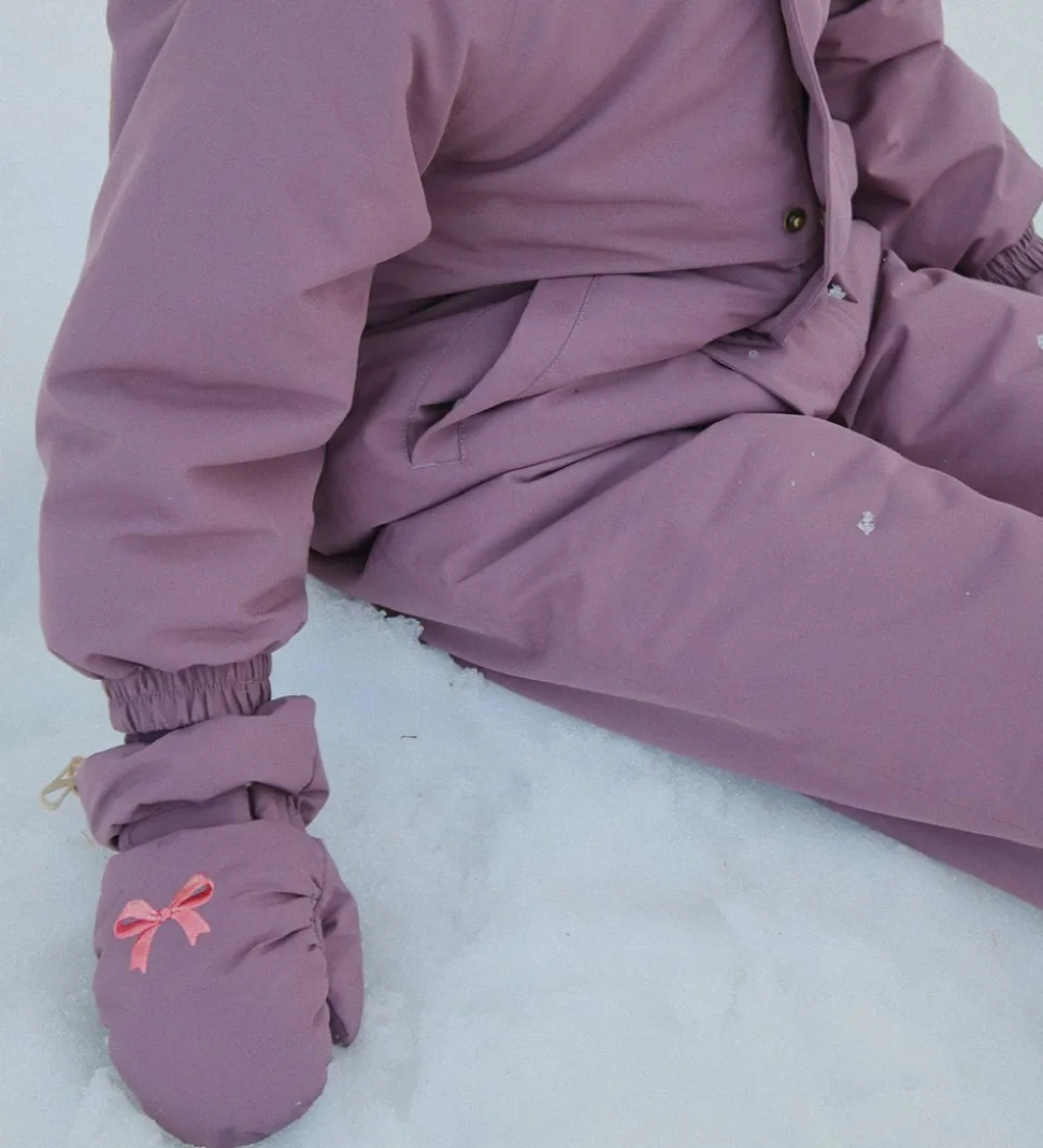 Fine Konges Sløjd luffer i en støvet lilla med en lille sløjfe broderet på toppen. Konges Sløjd lufferne er godt vatteret og har en elastikkant ved åbningerne der holder kulde og vind ude, samt en velcrorem ved håndleddene så de kan strammes godt ind.