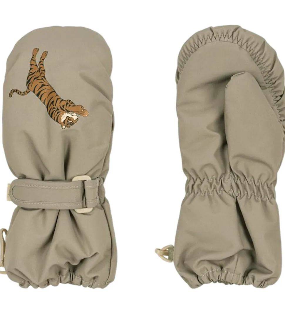 Skønne Konges Sløjd luffer i en støvet grøn med et lille tigerprint på toppen. Konges Sløjd lufferne er godt vatteret og har en elastikkant ved åbningerne der holder kulde og vind ude, samt en velcrorem ved håndleddene så de kan strammes godt ind.