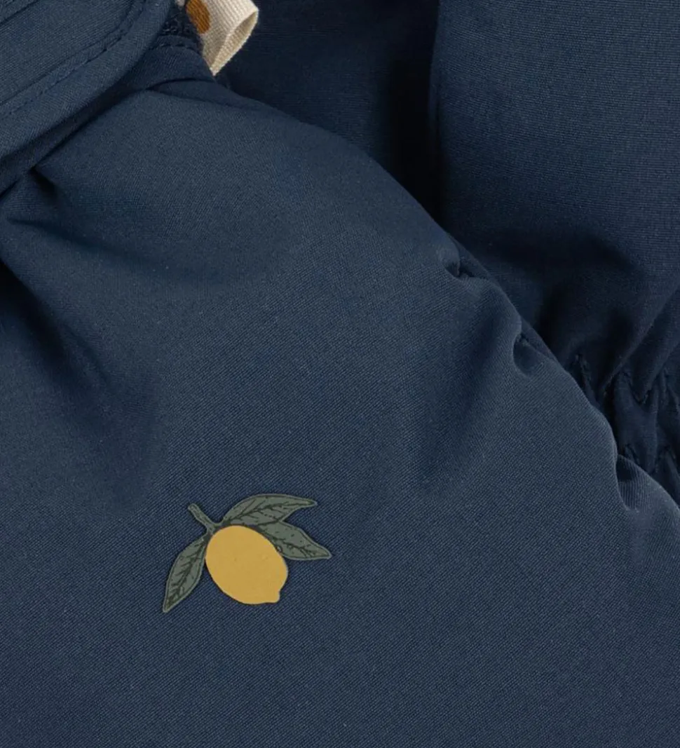 Smarte Konges Sløjd luffer i mørkeblå med en lille citron broderet på toppen. Konges Sløjd lufferne er godt vatteret og har en elastikkant ved åbningerne der holder kulde og vind ude, samt en velcrorem ved håndleddene så de kan strammes godt ind.