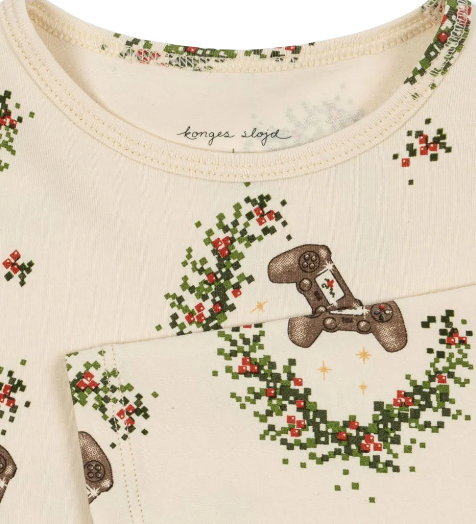 Charmerende Konges Sløjd nattøj bestående af en natbluse og et par natbukser i beige med et smart gamerprint i grønne og brune nuancer. Den langærmede natbluse og natbukserne er designet til komfort og stil og har et sammenhængende look.