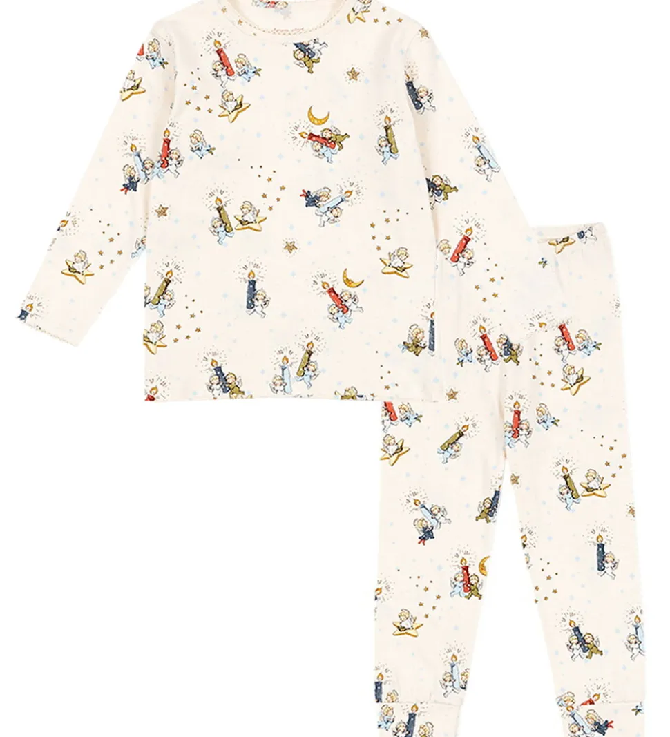 Behageligt Konges Sløjd nattøj bestående af en natbluse med lange ærmer og et par natbukser med elastisk talje i en skøn råhvid nuance. Nattøjet er dekoreret med et charmerende print af engle, stjerner og måner, der skaber et eventyrligt udtryk.