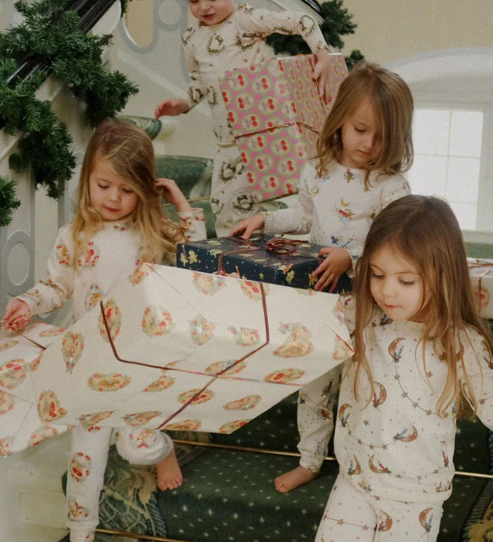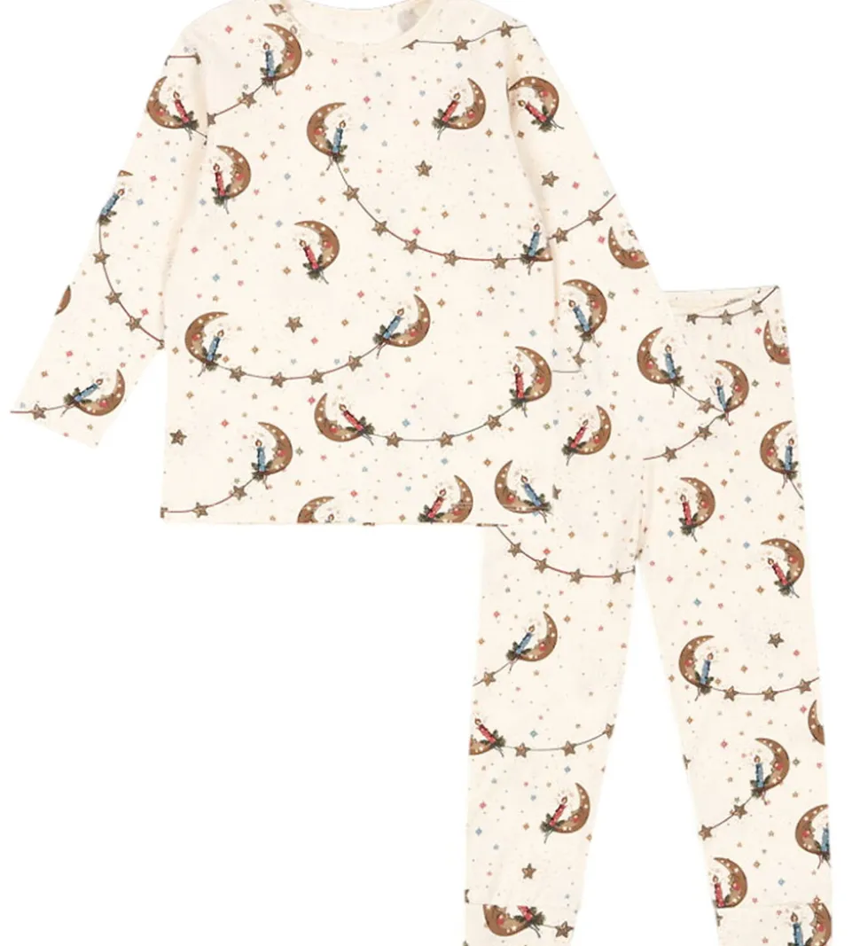 Dejligt Konges Sløjd nattøj bestående af en natbluse og et par natbukser i beige med et eventyrligt print af stjerner og måner. Natblusen har lange ærmer, mens natbukserne har en elastisk talje, der gør det ideelt til kølige nætter.