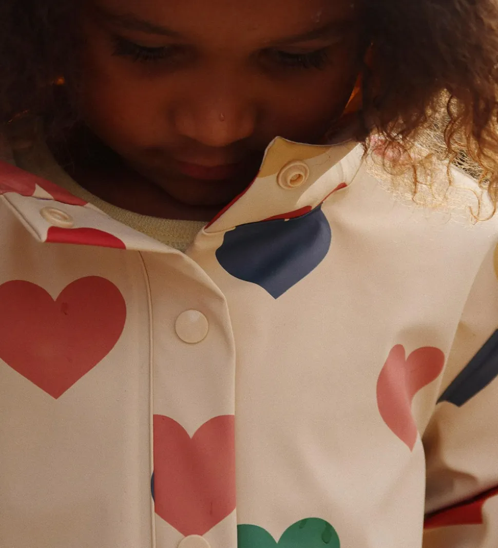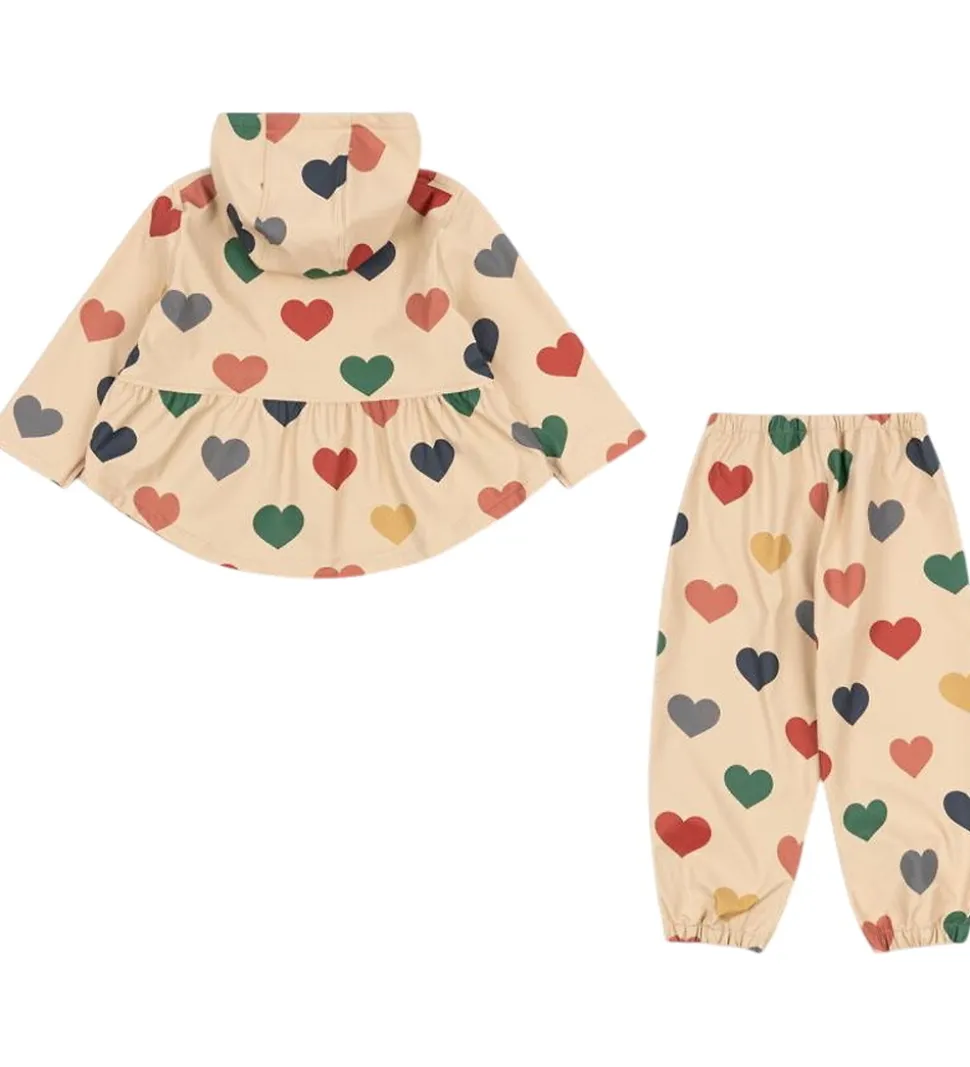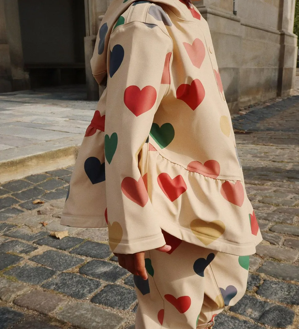 Lækkert Konges Sløjd regntøj i lysebeige med et farverigt hjerteprint.