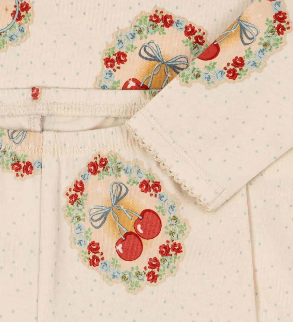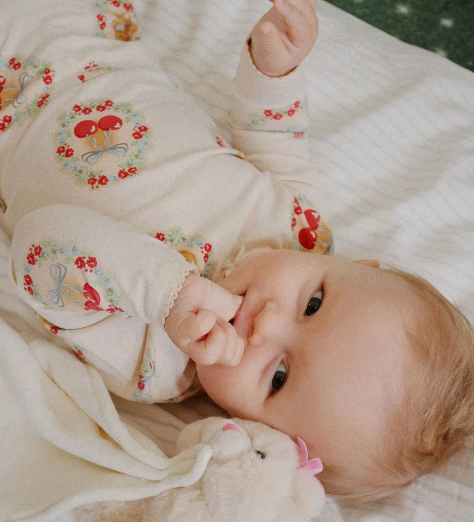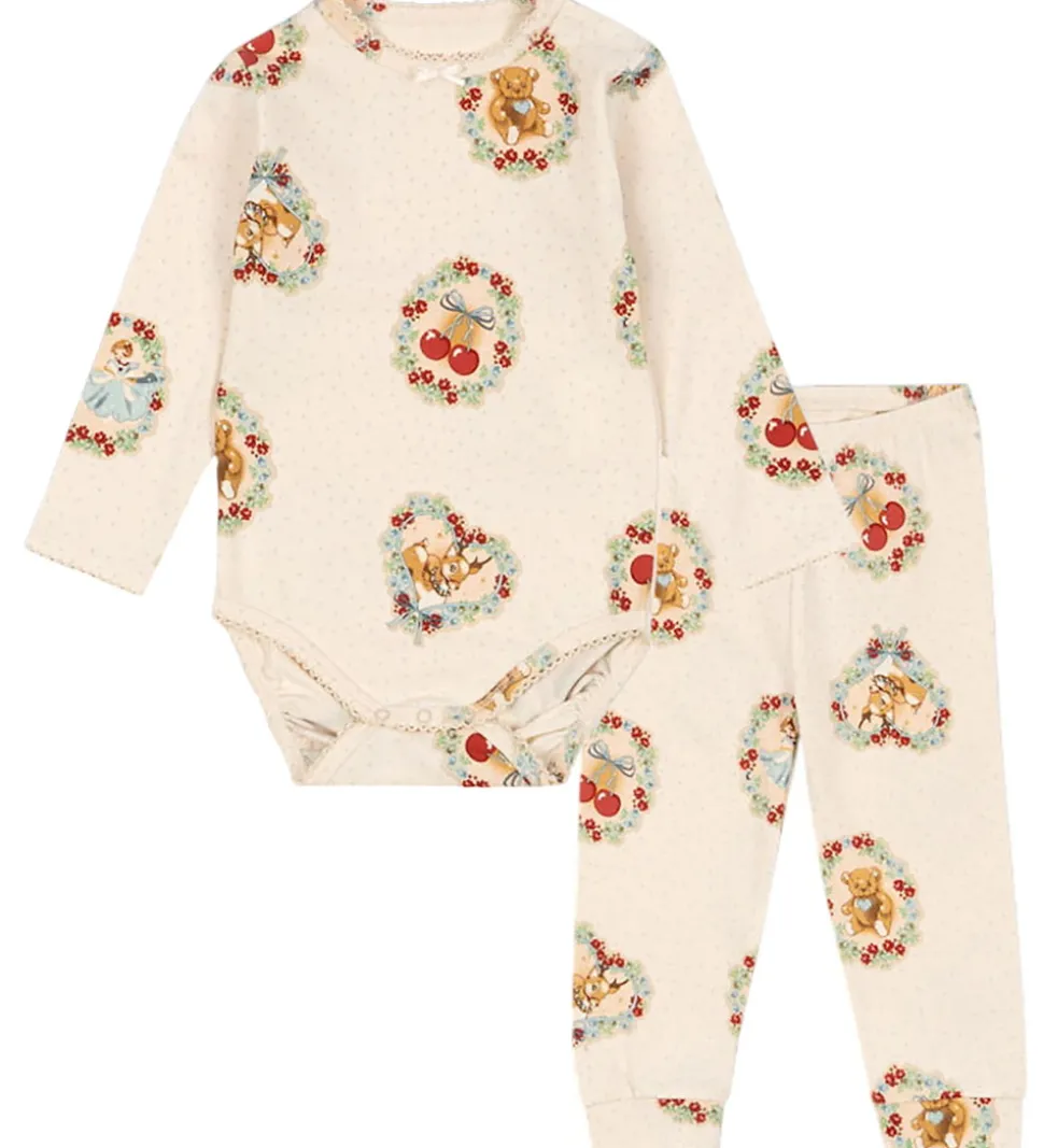 Charmerende Konges Sløjd sæt betående af en body og et par leggings. Sættet er beige med et sødt print med bamser og kirsebær indrammet af blomster i forskellige nuancer.