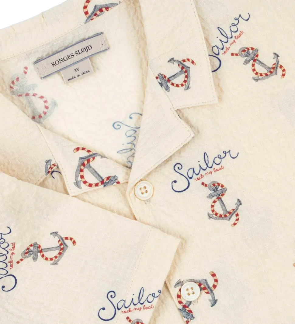 Skøn Konges Sløjd skjorte i bæk og bølge med korte ærmer i en lys, beige nuance med et fint anker- og sømandsprint. Skjorten er perfekt til små eventyrere, der søger komfort og stil.