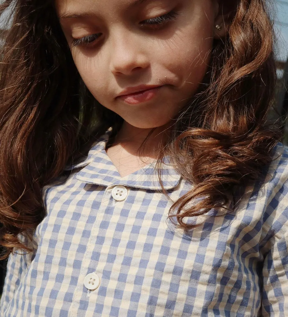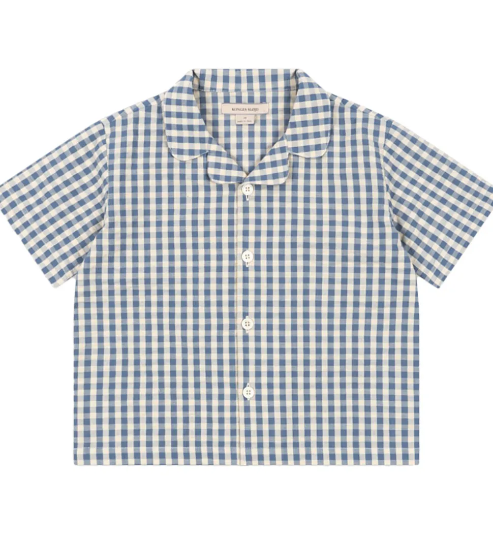 Lækker Konges Sløjd skjorte med korte ærmer i blå og cremehvid ternet design. Skjorten har en flot krave og knaplukning foran, hvilket giver et stilrent udtryk.