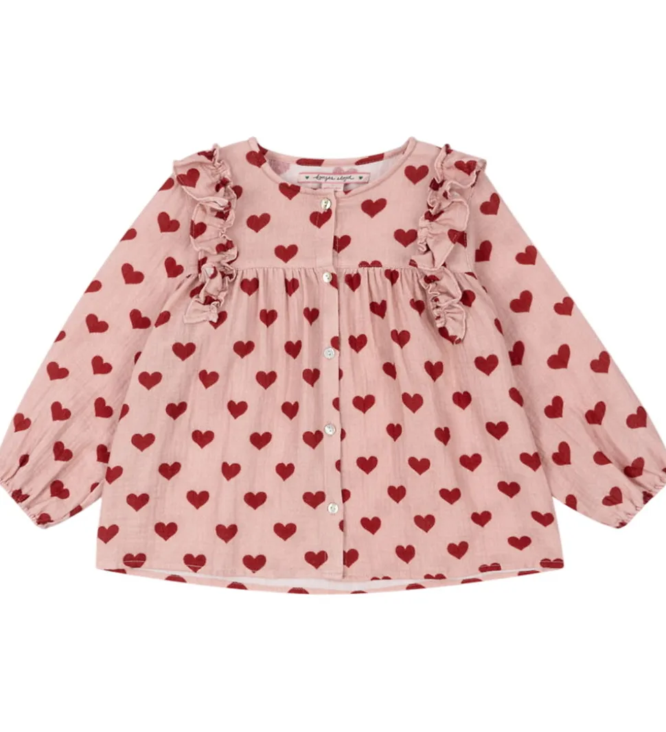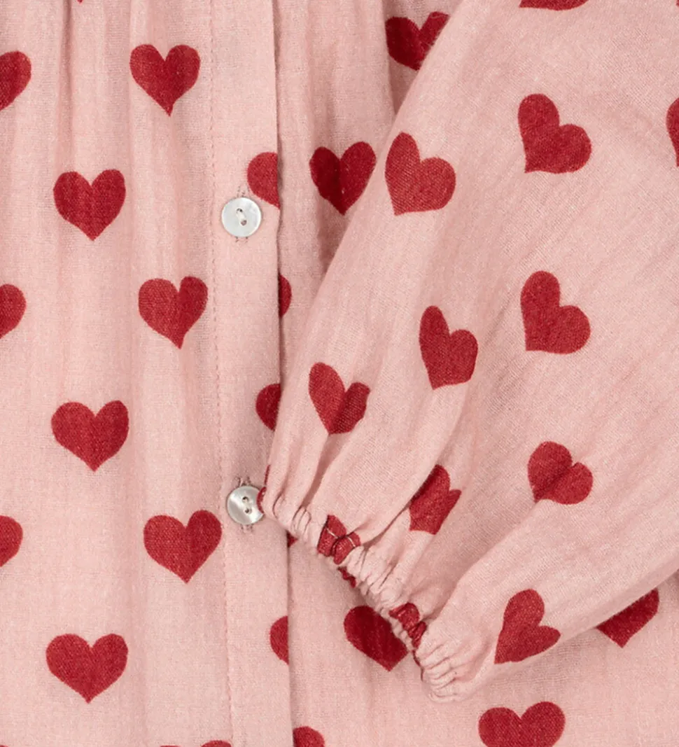 Charmerende Konges Sløjd skjorte med musselinstruktur og lange ærmer i en blød, rosa nuance med et print af røde hjerter. Skjorten har fine flæsedetaljer langs brystet og knaplukning foran. Konges Sløjd sikrer en behagelig pasform, der udstråler en sød stil.
