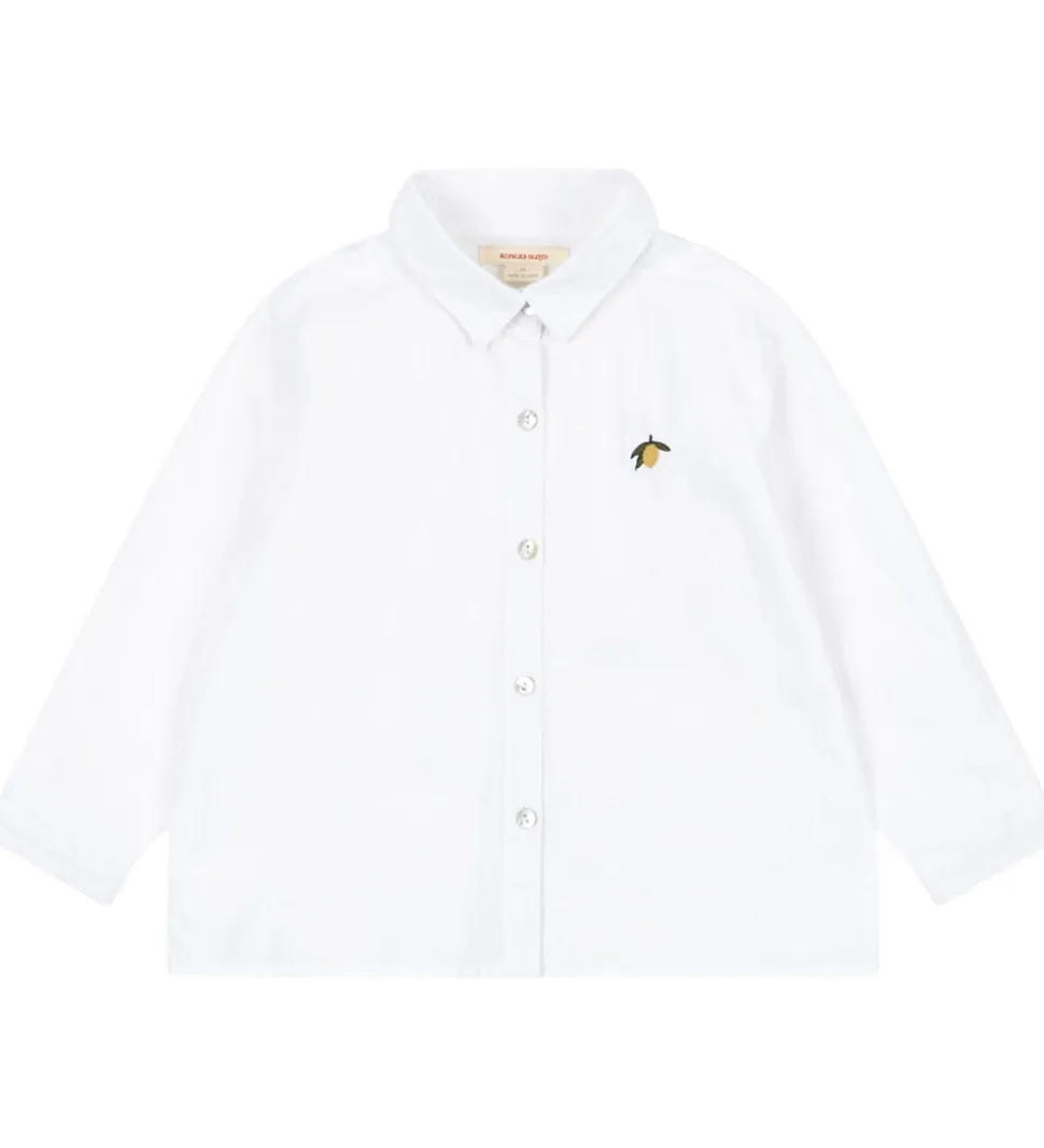 Elegant Konges Sløjd skjorte i ensfarvet hvid med en lille, subtil citronbrodering på brystet. Skjorten har lange ærmer og en klassisk krave, hvilket giver et tidløst udtryk. Den har en lige pasform og lukkes med en række af knapper foran.