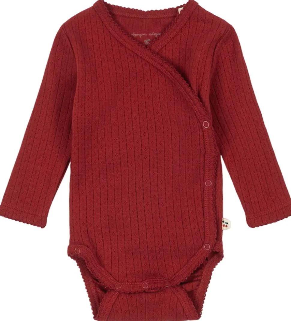 Flot Konges Sløjd body i ensfarvet rød med et flot hulmønster. Bodyen har et praktisk slå om-design, hvor den lukkes med trykknapper bed ad venstre side. Bodyen lukke benene med tre trykknapper.