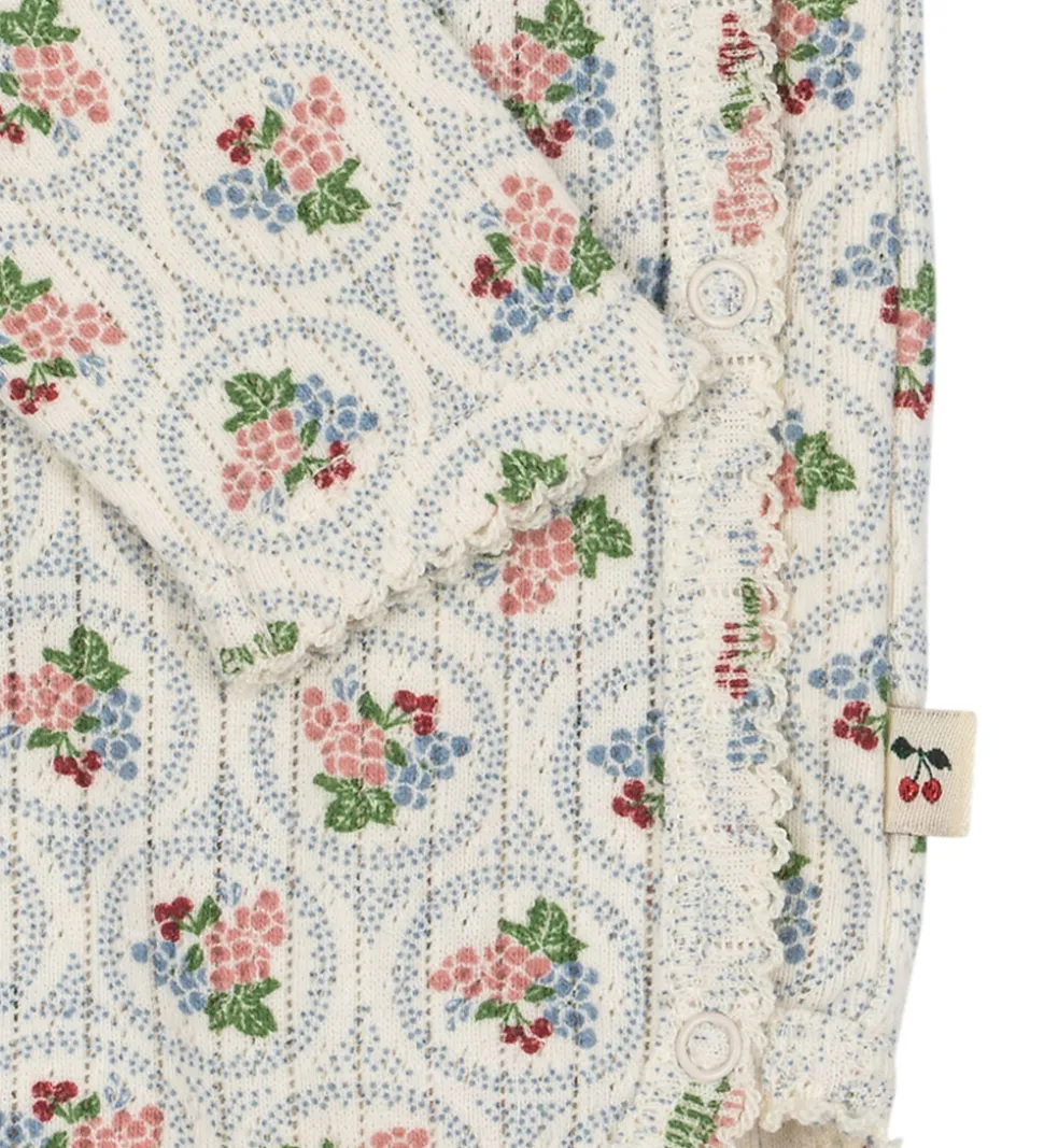 Charmerende Konges Sløjd slå-om body i hvid med et smukt blomstermønster i blå og rosa nuancer. Slå-om bodyen har et diskret hulmønster samt lange ærmer.