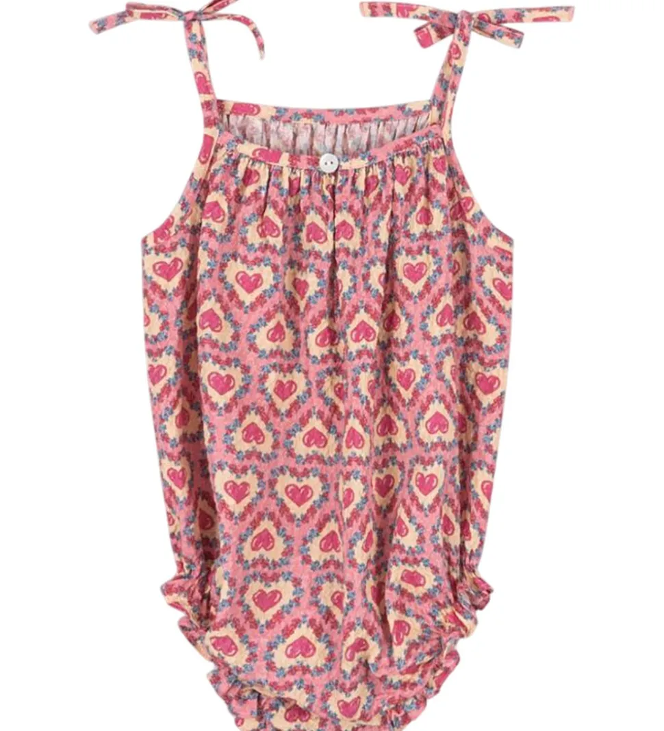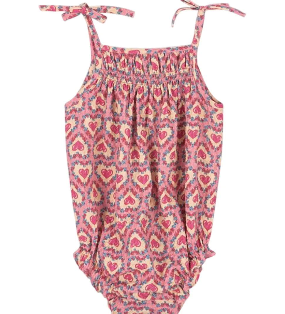 Herlig sommerdragt fra Konges Sløjd med et charmerende hjerte- og blomsterprint i rosa nuancer. Pasformen er løs med behagelig elastik omkring brystet, der giver en god fleksibilitet. Sommerdragten har også trykknapper mellem benene for nem påklædning.