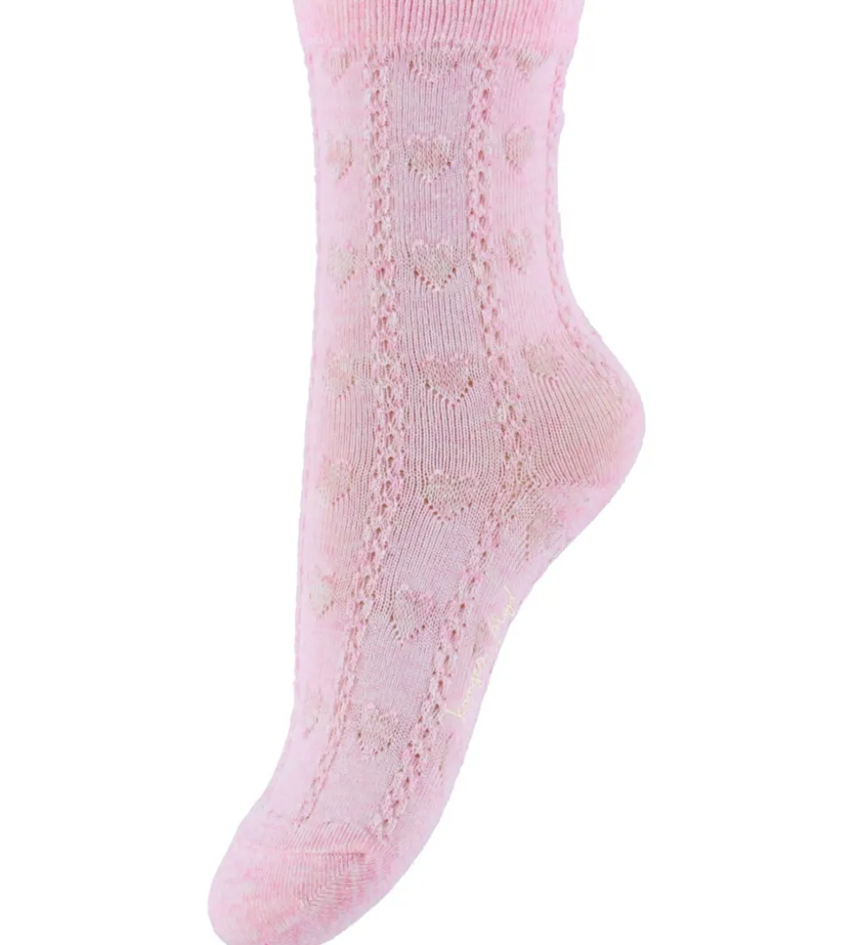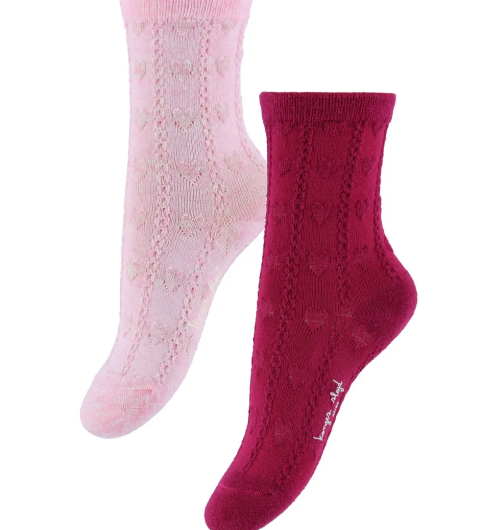 Charmerende Konges Sløjd strømper i en praktisk 2-pak med et par i lyserød og et i fuchsia. Begge par strømper har et diskret hjertemønster og en fin ribkant øverst på skaftet. Konges Sløjd strømperne har et behageligt design, der sikrer en god pasform.