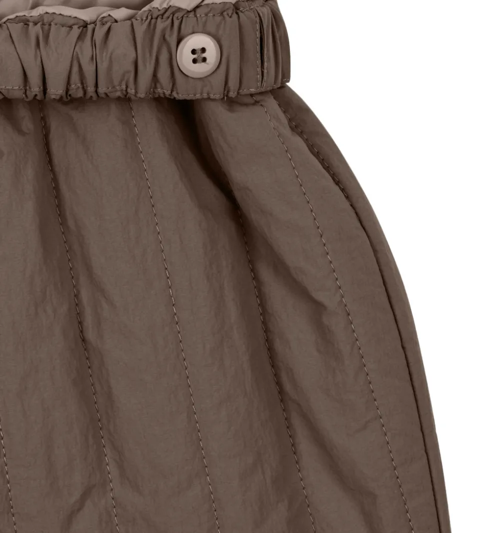 Lækre Konges Sløjd termobukser i quiltet, ensfarvet mørkebrun. Konges Sløjd termobukserne har en god, justerbar elastikkant i livet, og praktiske ribkanter i benåbningerne, der holder vind og kulde ude.