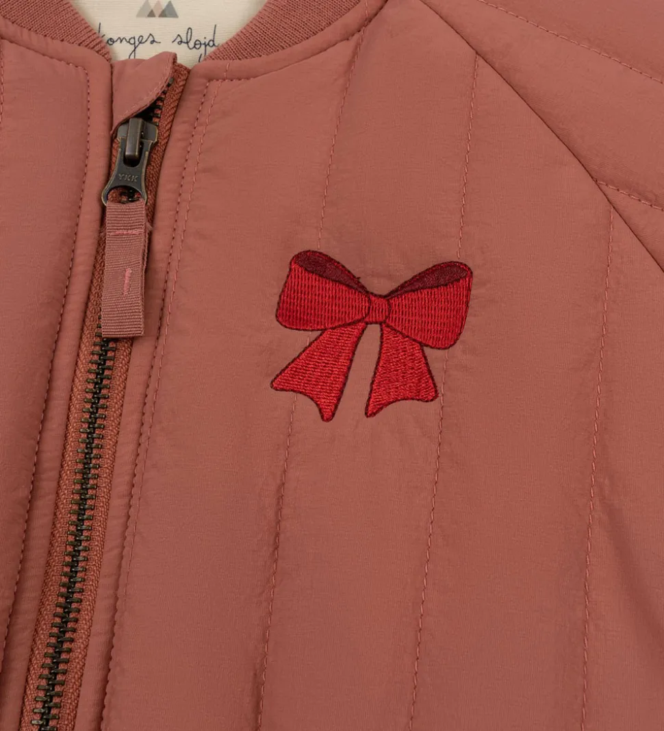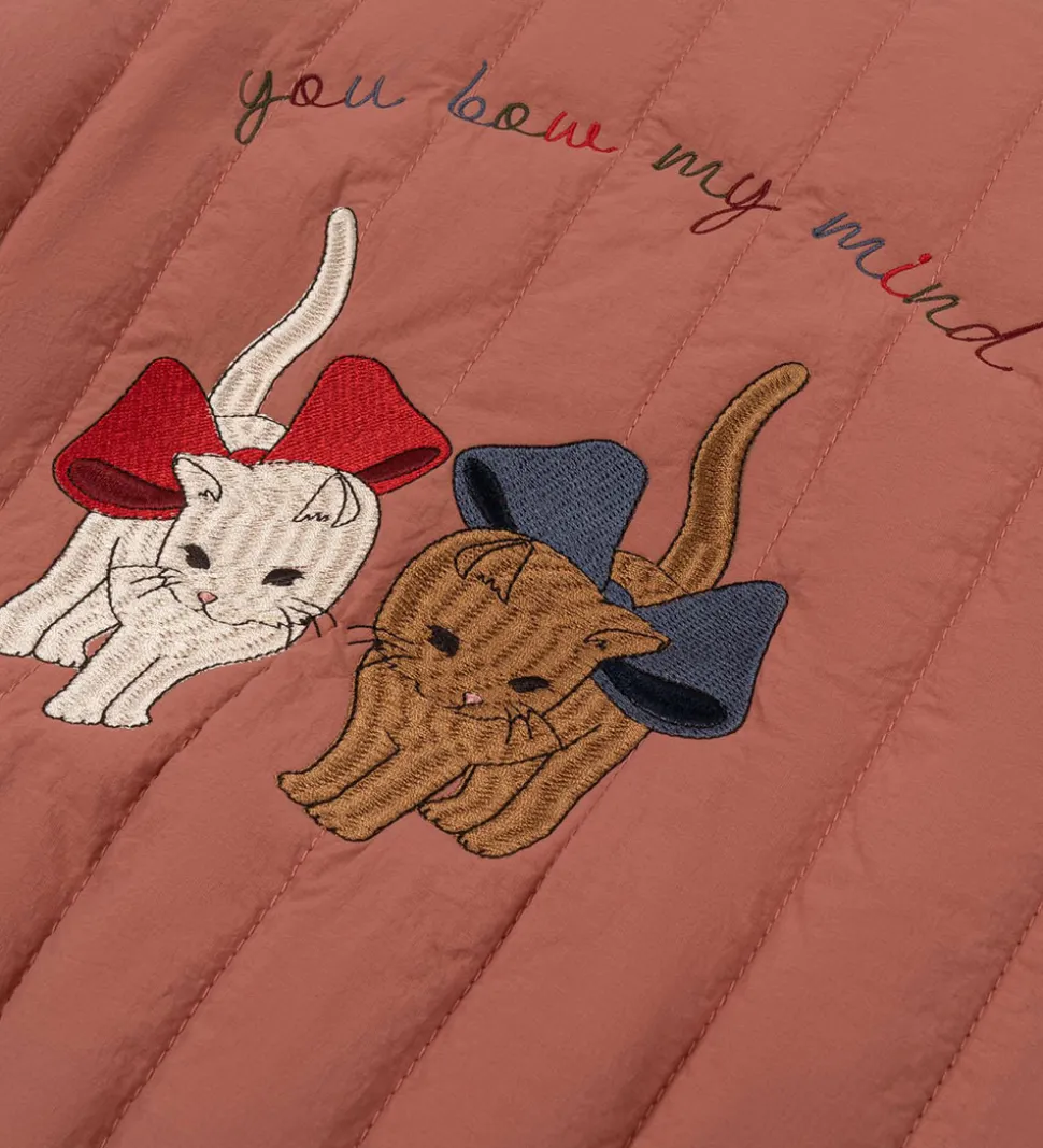 Flot Konges Sløjd termojakke i en varm orangerosa nuance med en rød sløjfe broderet på venstre bryst. På ryggen er der broderet to katte med sløjfer omkring halsen og teksten “You Bow My Mind”.