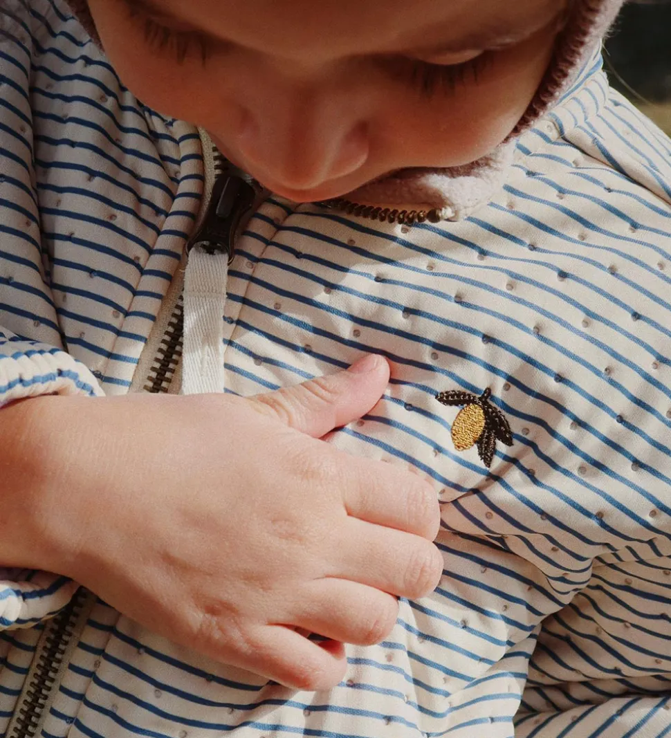 Skøn Konges Sløjd termojakke i cremehvid med blå striber og med en lille, broderet citron på fronten.
