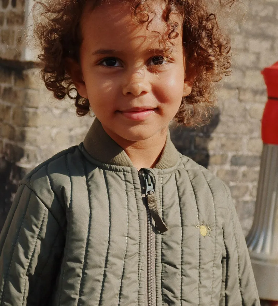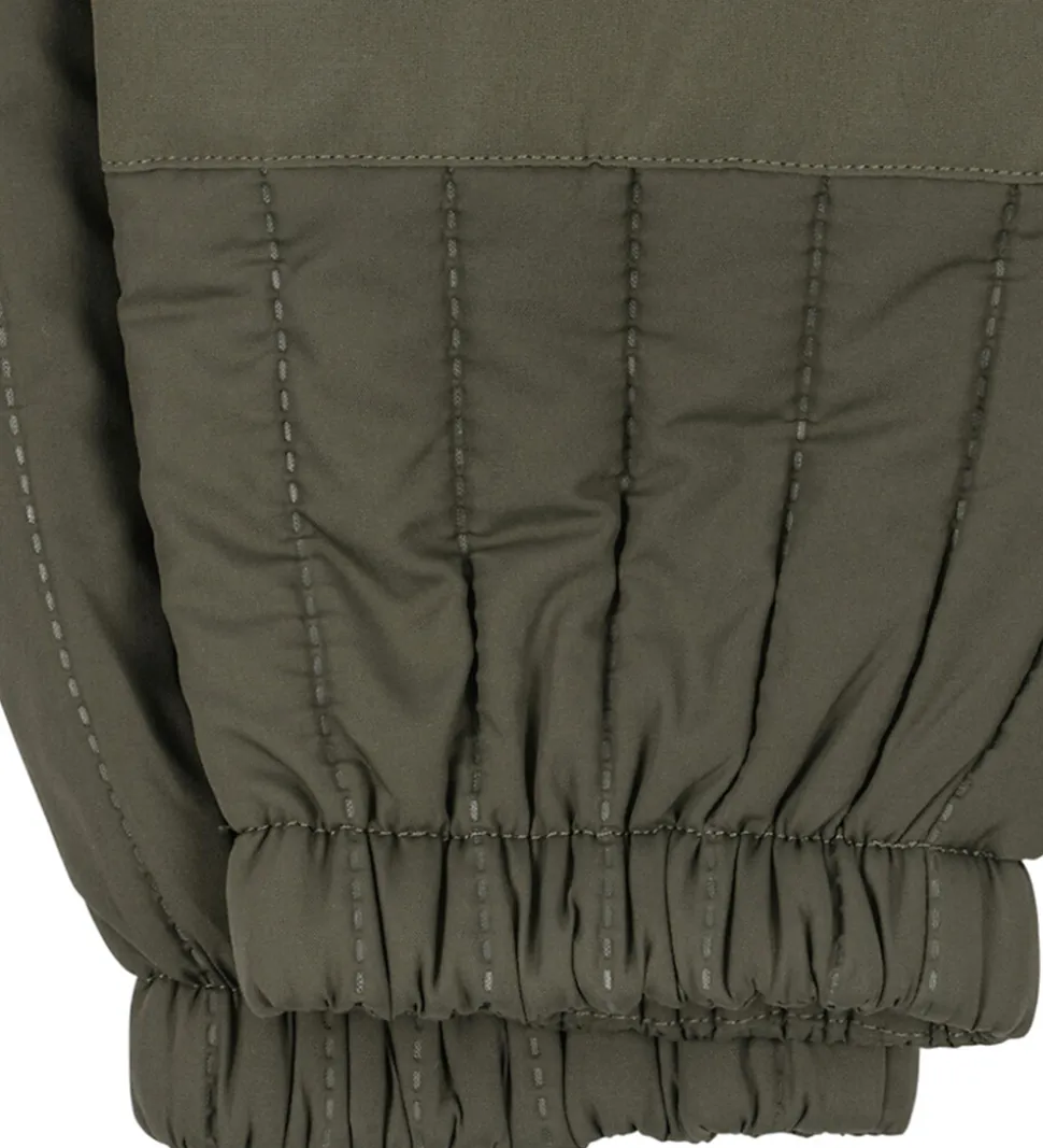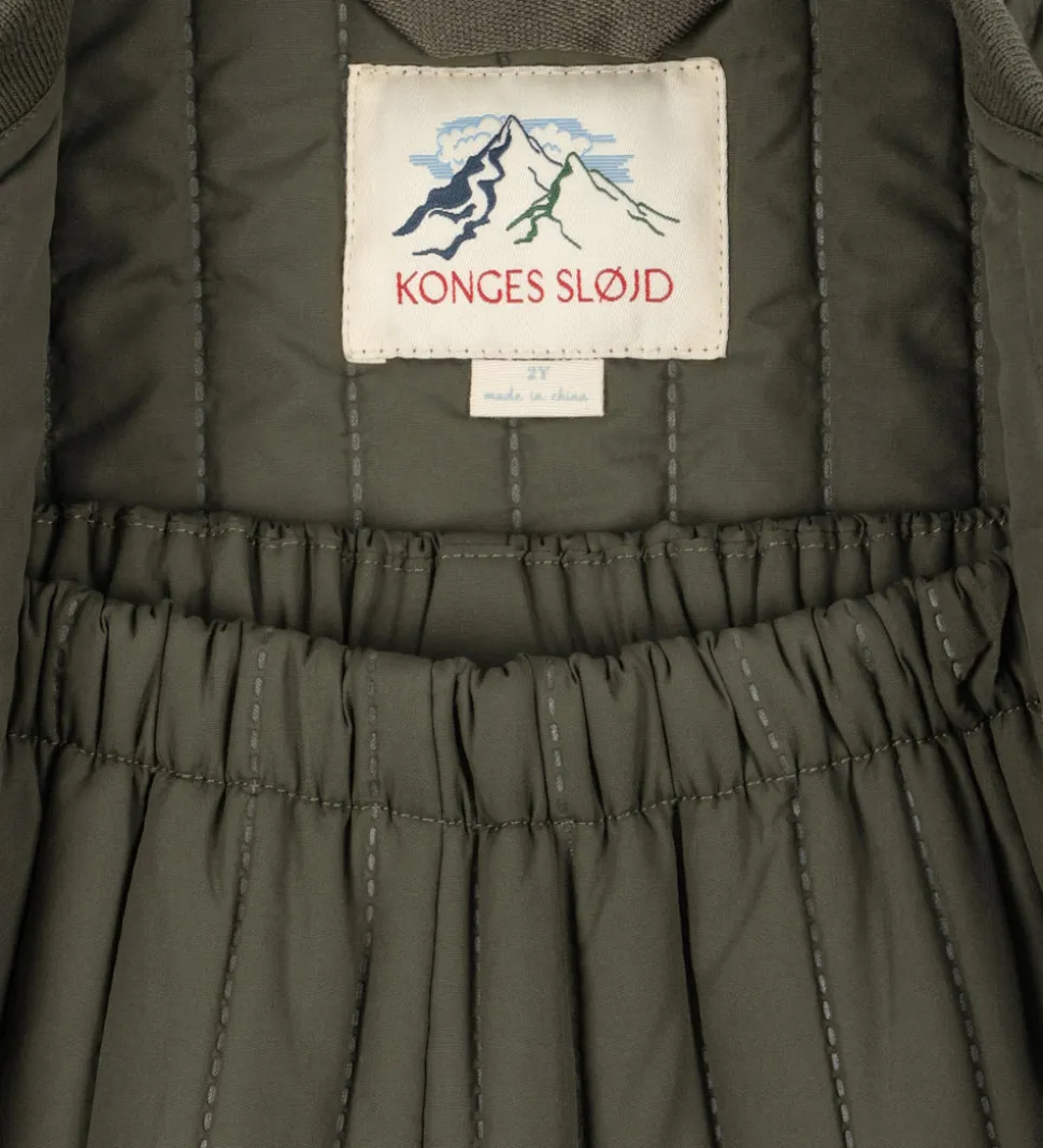 Lækkert Konges Sløjd termosæt i en stilren, olivengrøn nuance med en elegant, vertikal syningsstruktur. Termojakken har en praktisk mellemhøj krave og lukkes med en gennemgående lynlås med hagebeskytter og indvendig vindstolpe. Ærmerne har elastikkanter, som giver en behagelig pasform.
