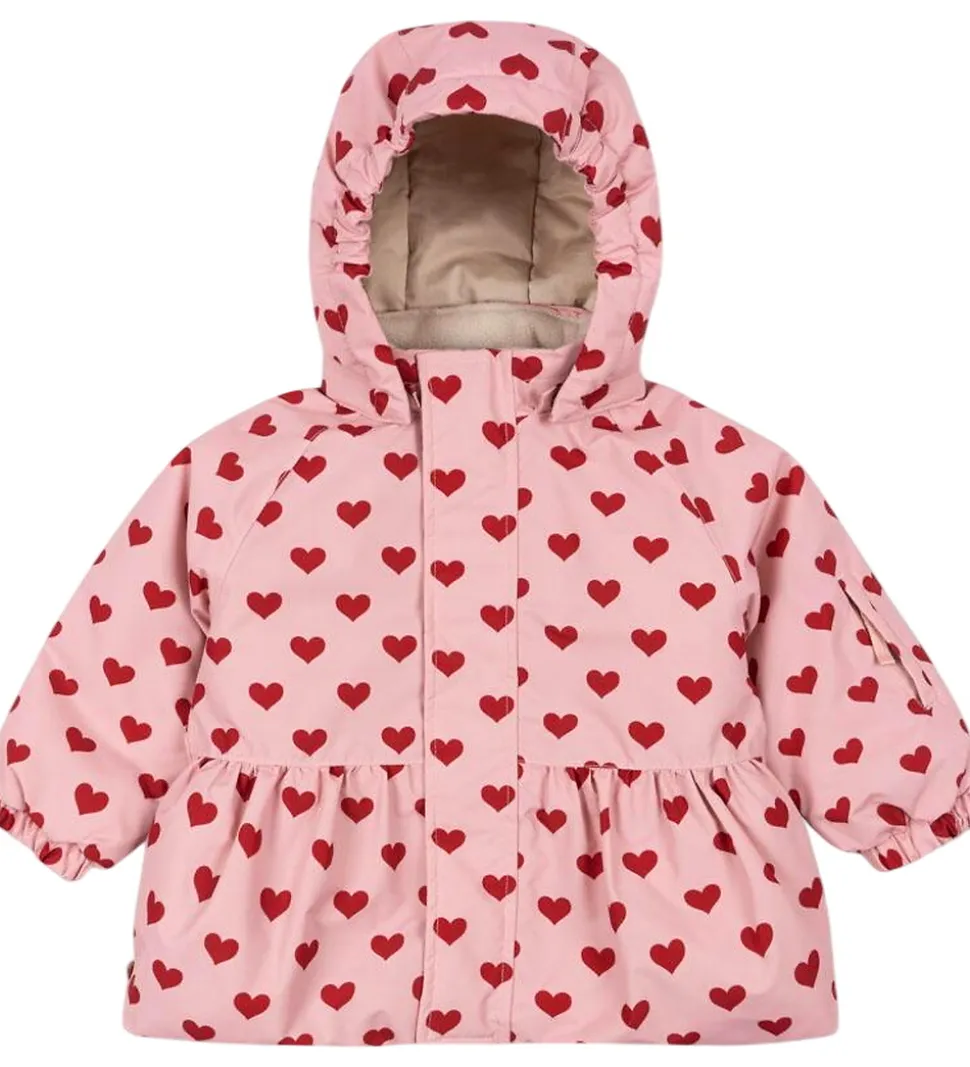 Sød Konges Sløjd vinterjakke i rosa med et alloverprint af røde hjerter.