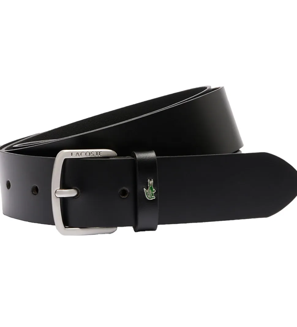 Lækkert Lacoste bælte i sort med et diskret logoprint i form af en grøn krokodille. Bæltet har et klassisk design, der tilføjer en elegant detalje til ethvert outfit.