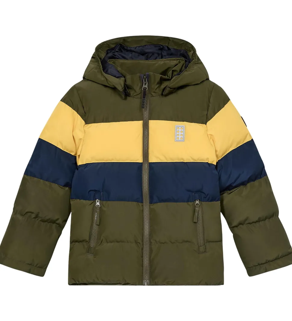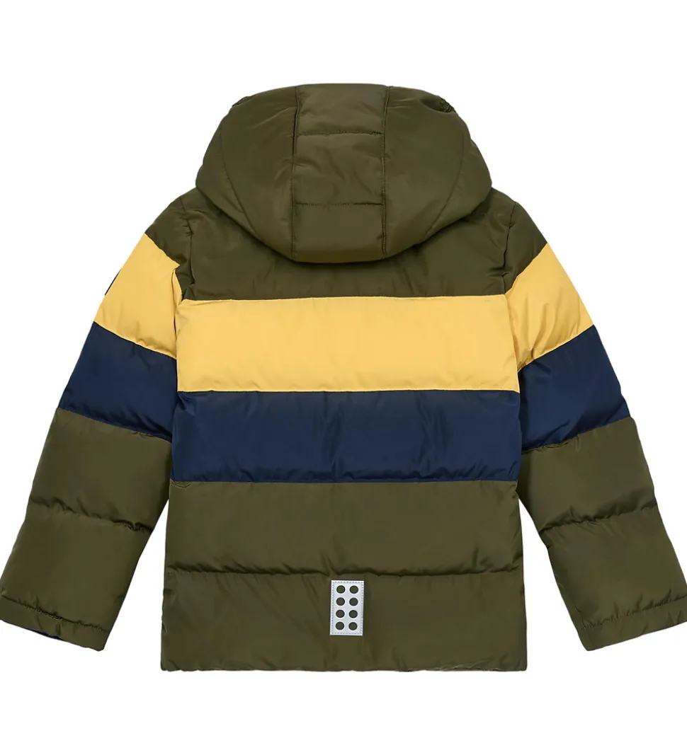 Fin LEGO® Wear dynejakke i armygrøn med et bredstribet design i gul og navy.
