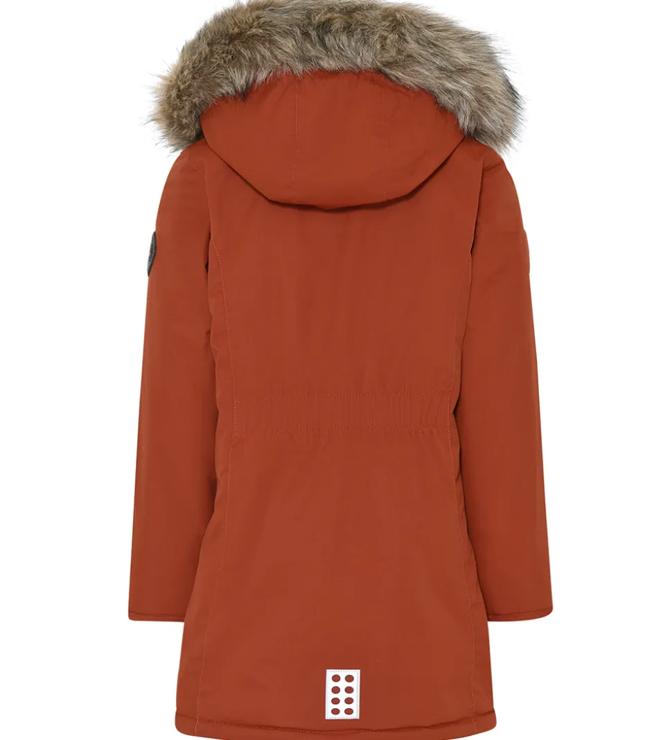 LEGO® Wear vinterjakken har en aftagelig hætte, som fæstnes med trykknapper langs den fleeceforede halskrave. Hætten har en flot, imiteret pelskant, der kan tages af ved hjælp af skjulte knapper. I armåbningerne er der brede ribkanter med snefang.