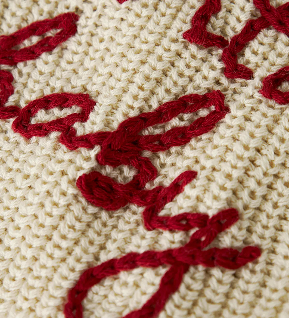 Charmerende Lil Atelier bluse i hvid med teksten “Santa baby” broderet på forsiden i en varm, rød nuance. Blusen har en ribstrikket struktur og er udstyret med praktiske knapper ved den ene skulder for nem påklædning. De lange ærmer og rund halsudskæring fuldender det enkle design fra Lil Atelier.
