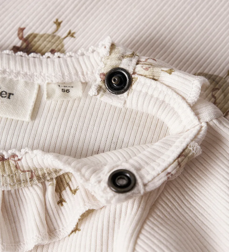 Bodyen fra Lil Atelier har bløde kanter ved ærmer og ben, samt praktiske trykknapper i bunden og ved venstre skulder for nem åbning og lukning.