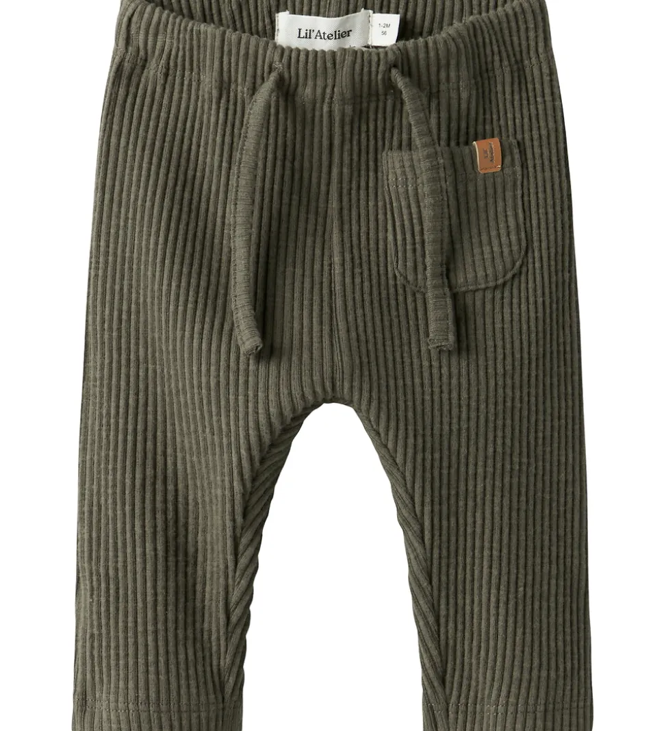 Charmerende bukser fra Lil’ Atelier i en dyb grøn nuance. Lil’ Atelier bukserne er fremstillet med en blød ribstruktur. De har en elastisk talje med snøre, som sikrer en behagelig pasform. Foran er der en lille åben lomme, der tilføjer et praktisk element.