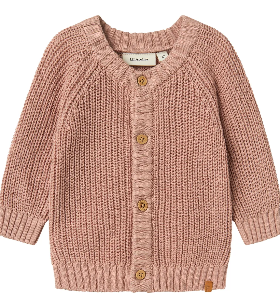 Lækker Lil Atelier cardigan i en varm rosa nuance. Lil Atelier cardiganen har en skøn strikket struktur med ribkanter i alle cardiganens åbninger. Den har en klassisk knaplukning fortil med træknapper. Cardiganen har en rund halsudskæring og lange ærmer.