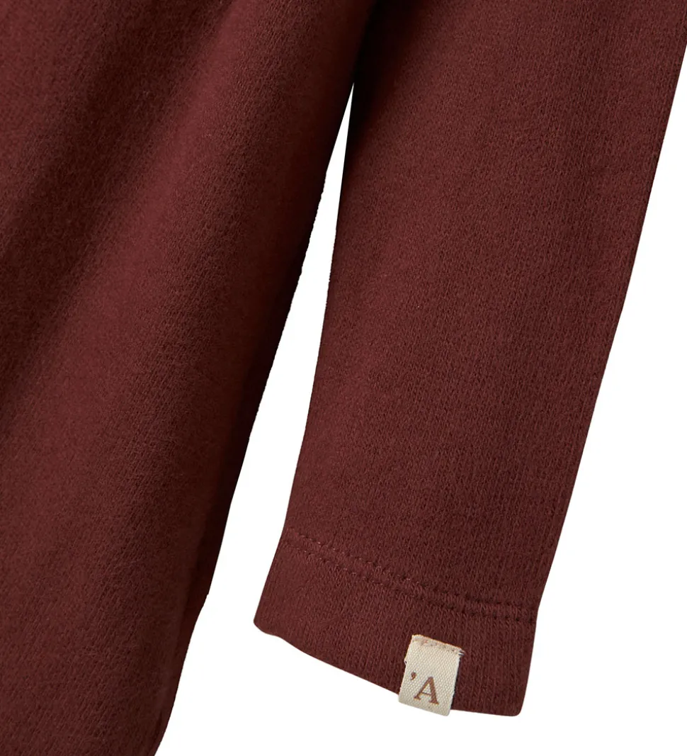 Flot Lil Atelier kjole i vinrød i fin strikket kvalitet. Lil Atelier kjolen har en rund halsudskæring med en knap i nakken. Den har lange ærmer og fine flæsedetaljer ved skuldrene. Under brystet er der en syning, som giver skørtet et let fald.