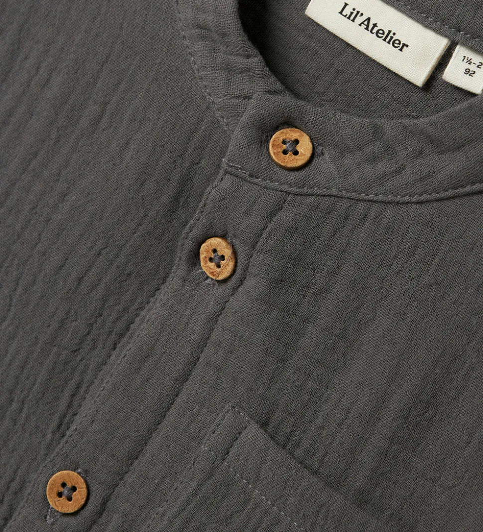 Stilfuld Lil’ Atelier skjorte i mørkegråt musselin med lange ærmer, og den er uden krave. Skjorten har en række af kontrasterende knapper og en praktisk brystlomme. Den bløde struktur af materialet giver skjorten et moderne udtryk. Skjorte fra Lil Atelier fungerer godt til mange lejligheder.