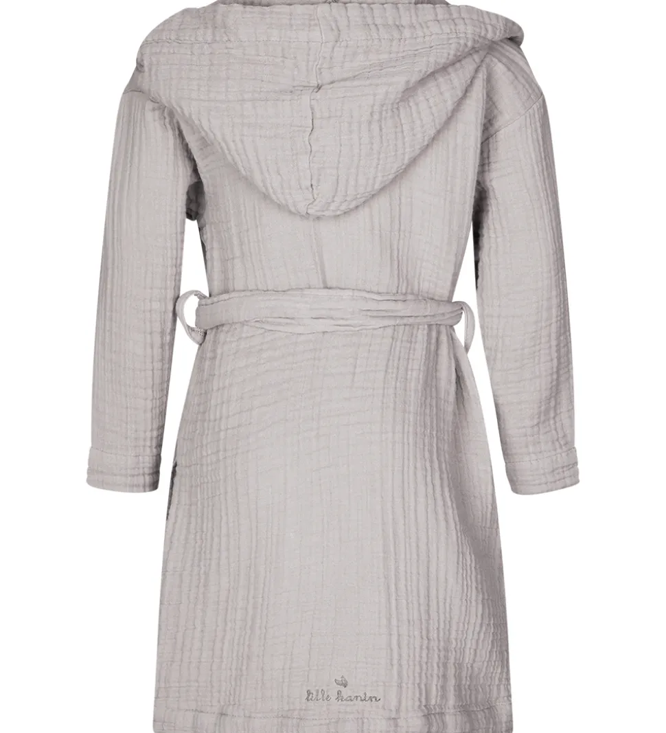 Lille Kanin badekåben er i blødt musselin og har lange ærmer og en fast hætte, og den lukkes til med et bindebånd omkring taljen.