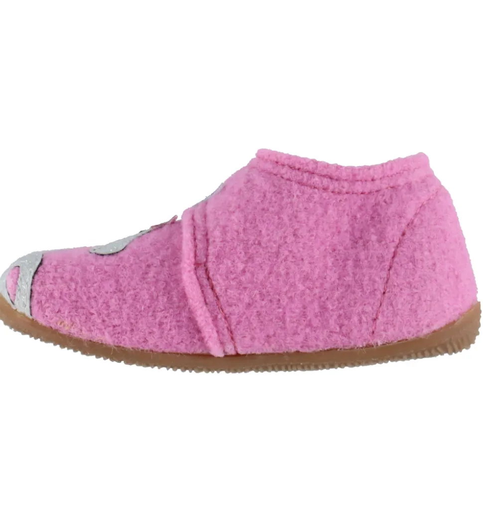 Fine Living Kitzbühel hjemmesko i pink uld med enhjørningeprint på begge fødder.
