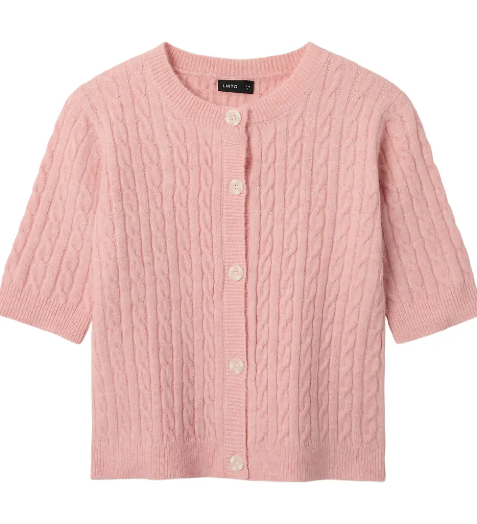 Charmerende LMTD cardigan i en blød lyserød nuance. Cardiganen præsenterer et klassisk flettet kabelmønster, der strækker sig over hele stykket. LMTD cardiganen har en kortærmet pasform og er udstyret med en rund halsudskæring. Den lukkes med fem diskrete knapper foran, hvilket giver den et harmonisk look. Ribkanter afslutter designet ved ærmerne samt forneden.