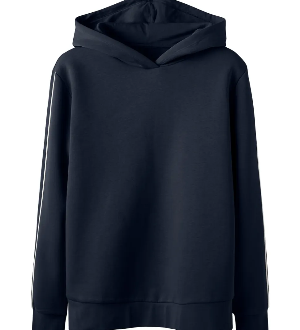 Stilren LMTD hættetrøje i en dyb, mørkeblå farve. LMTD hættetrøje har en klassisk hætte og er designet med ribkanter ved håndleddene og livet. Langs ærmerne ses diskrete, lyse striber, der giver et moderne udtryk.