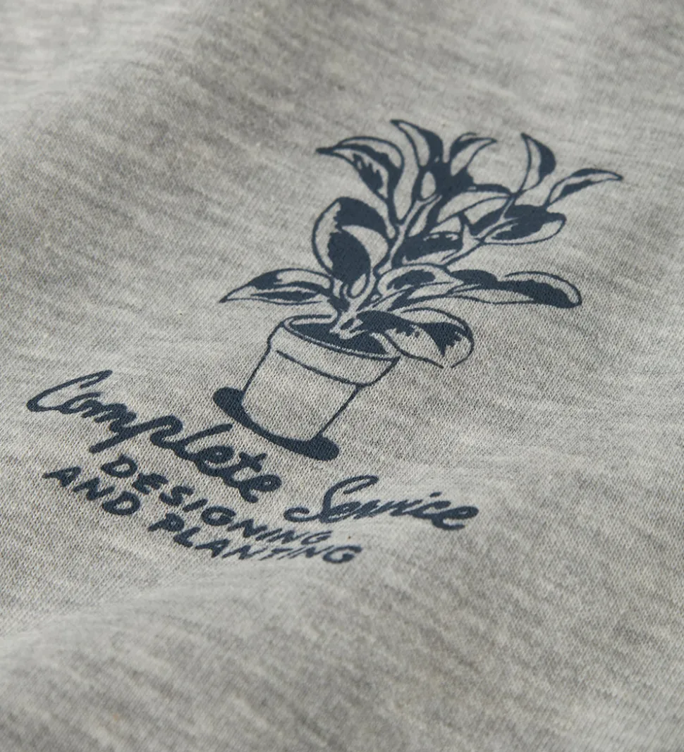 Elegant LMTD hættetrøje i en lys grå nuance. Hættetrøjen har en stilren struktur med ribkanter ved håndleddene og i bunden. På brystet findes et diskret print af en plante sammen med teksten “Complete Service”. LMTD hættetrøjen har blødt børstet bomuld på indersiden.