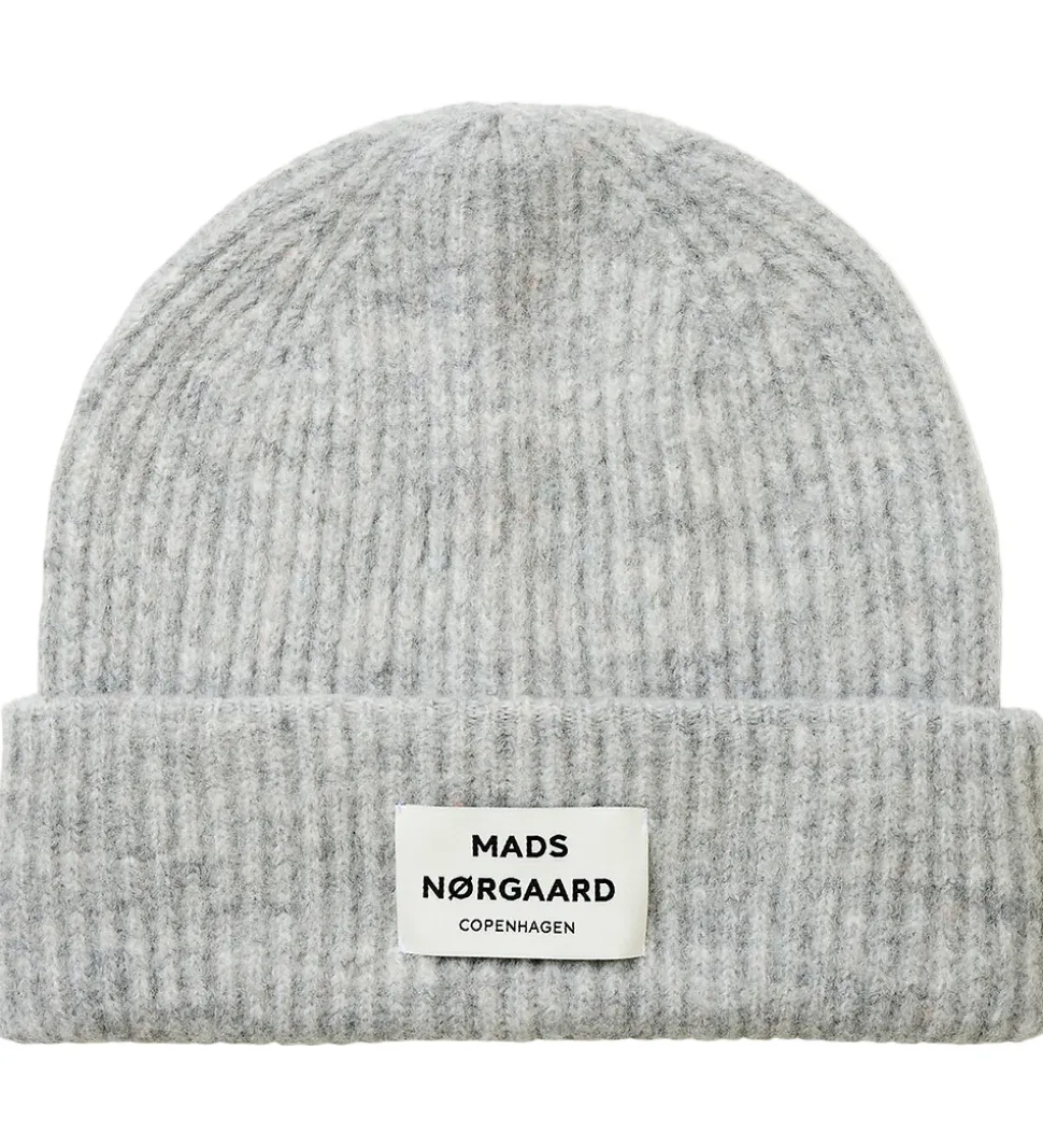 Skøn Mads Nørgaard hue i meleret grå i en strikket kvalitet med en flot ribstruktur.