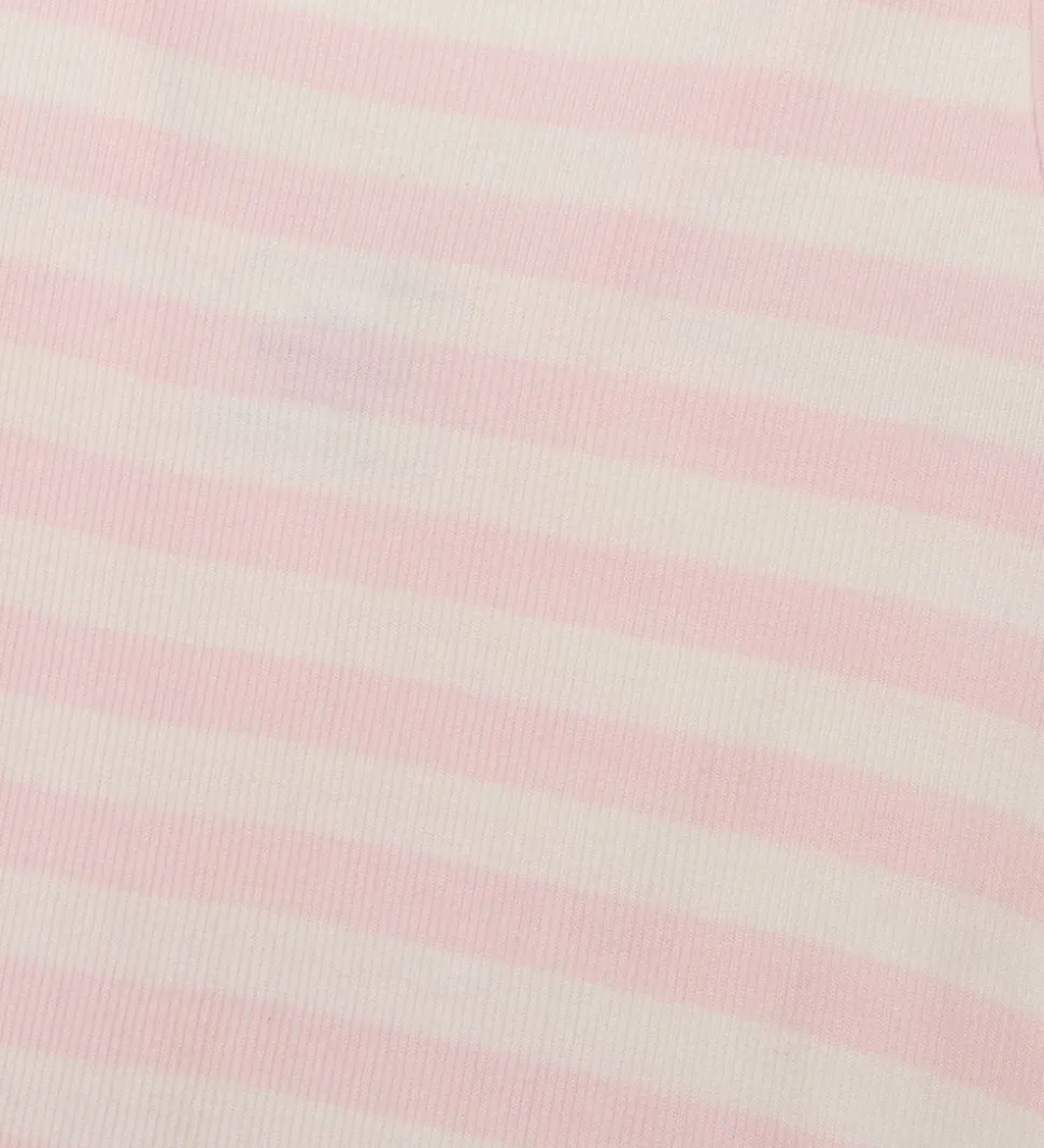 Flot Mads Nørgaard top med vandrette striber i rosa og hvid, med en god ribstruktur. Kanterne er rosa.