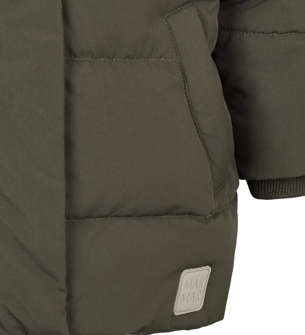 Stilfuld Marmar dunjakke i mørkegrå med grønt skær. Dunjakken har vandrette syninger og et påsyet logo i grå nederst i venstre side.