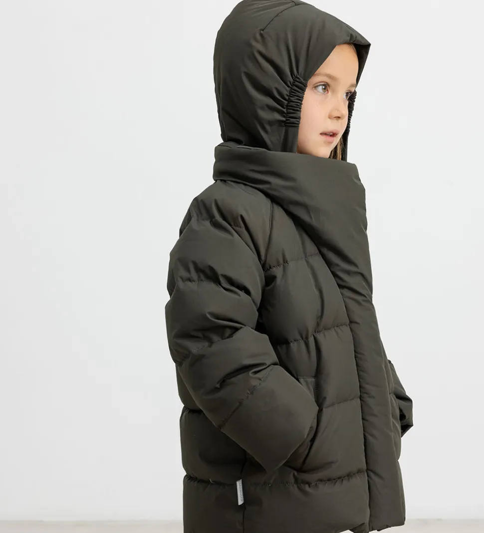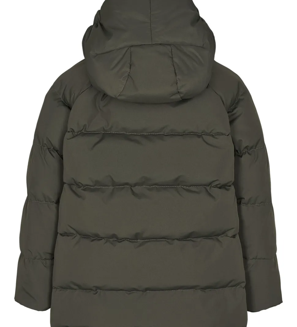 Smart Marmar dunjakke i mørkegrå med grønt skær. Dunjakken har vandrette syninger og et påsyet logo i grå nederst i venstre side.