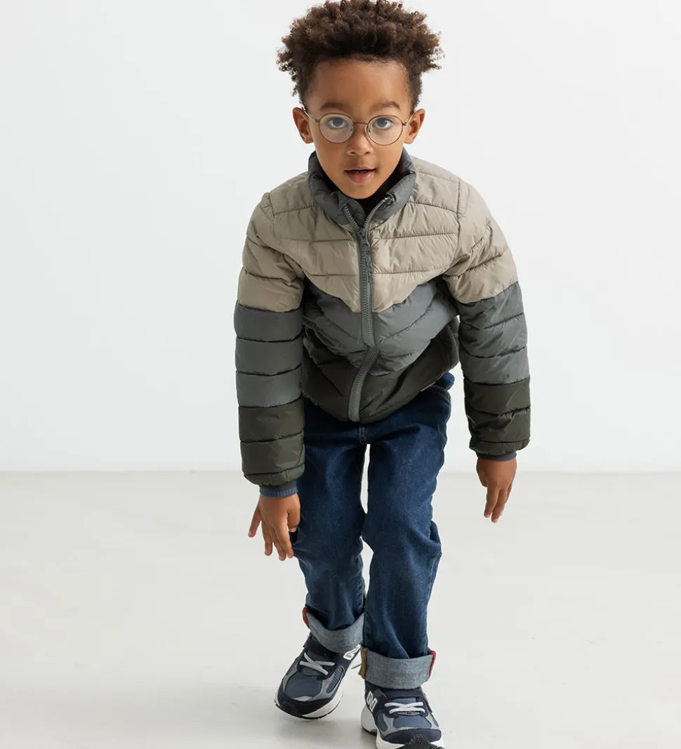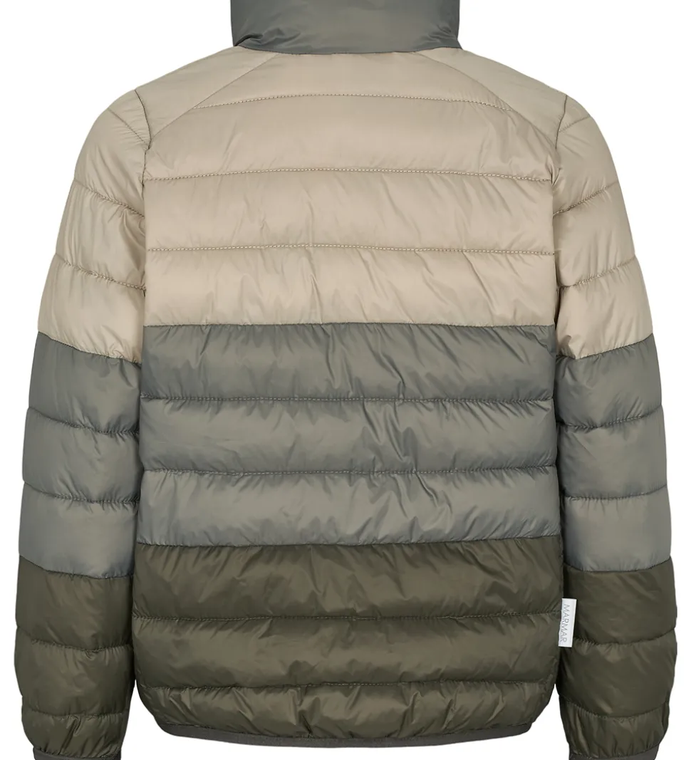 Smart MarMar dunjakke med brede, vandrette striber i grå nuancer.