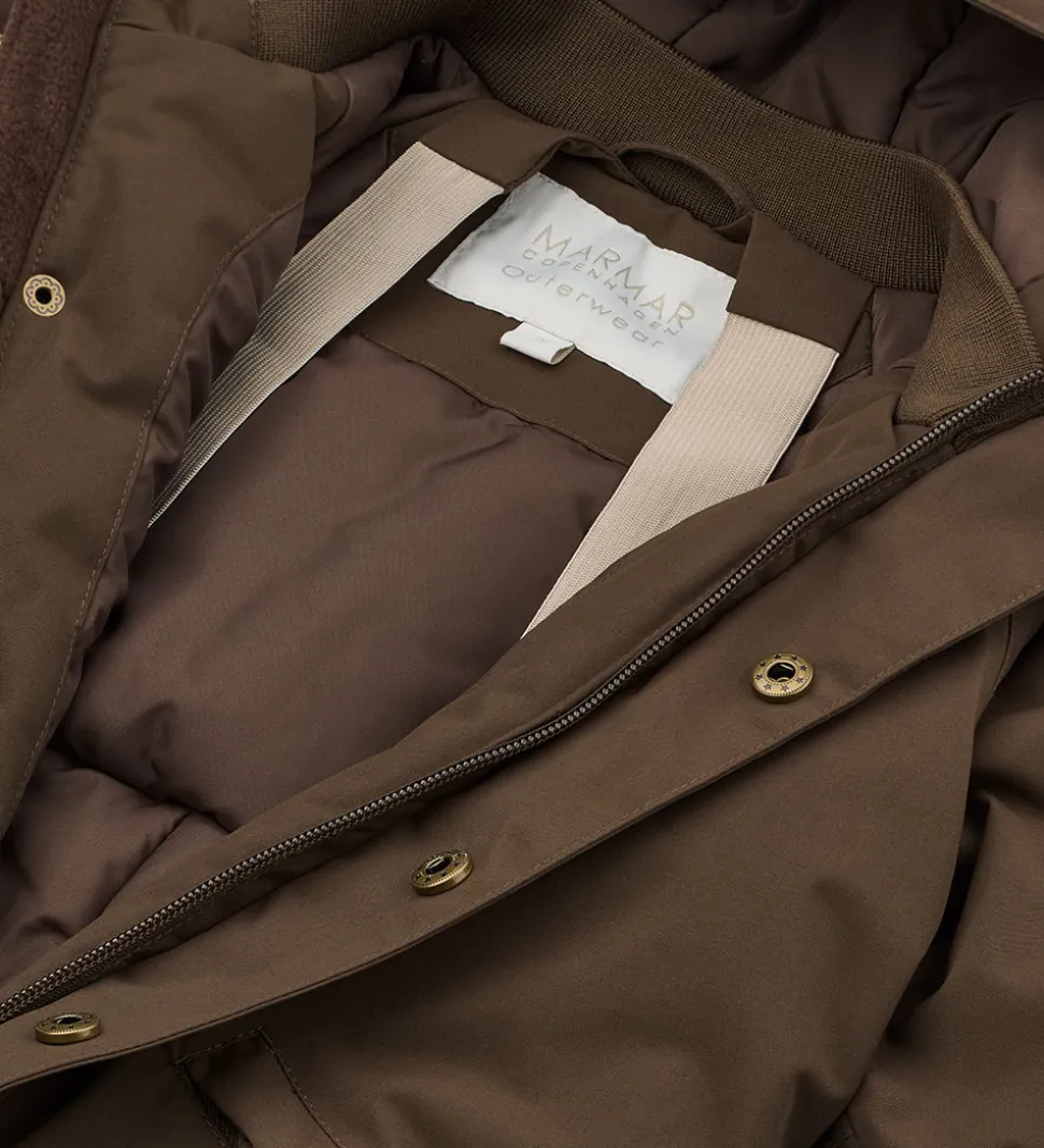 MarMar flyverdragten har en aftagelig hætte, der fæstnes med trykknapper langs halskraven. Hætten har elastik i siderne, og kan lukkes med en trykknap under hagen. Flyverdragten har snefang ved ærmeåbningerne med brede ribkanter.
