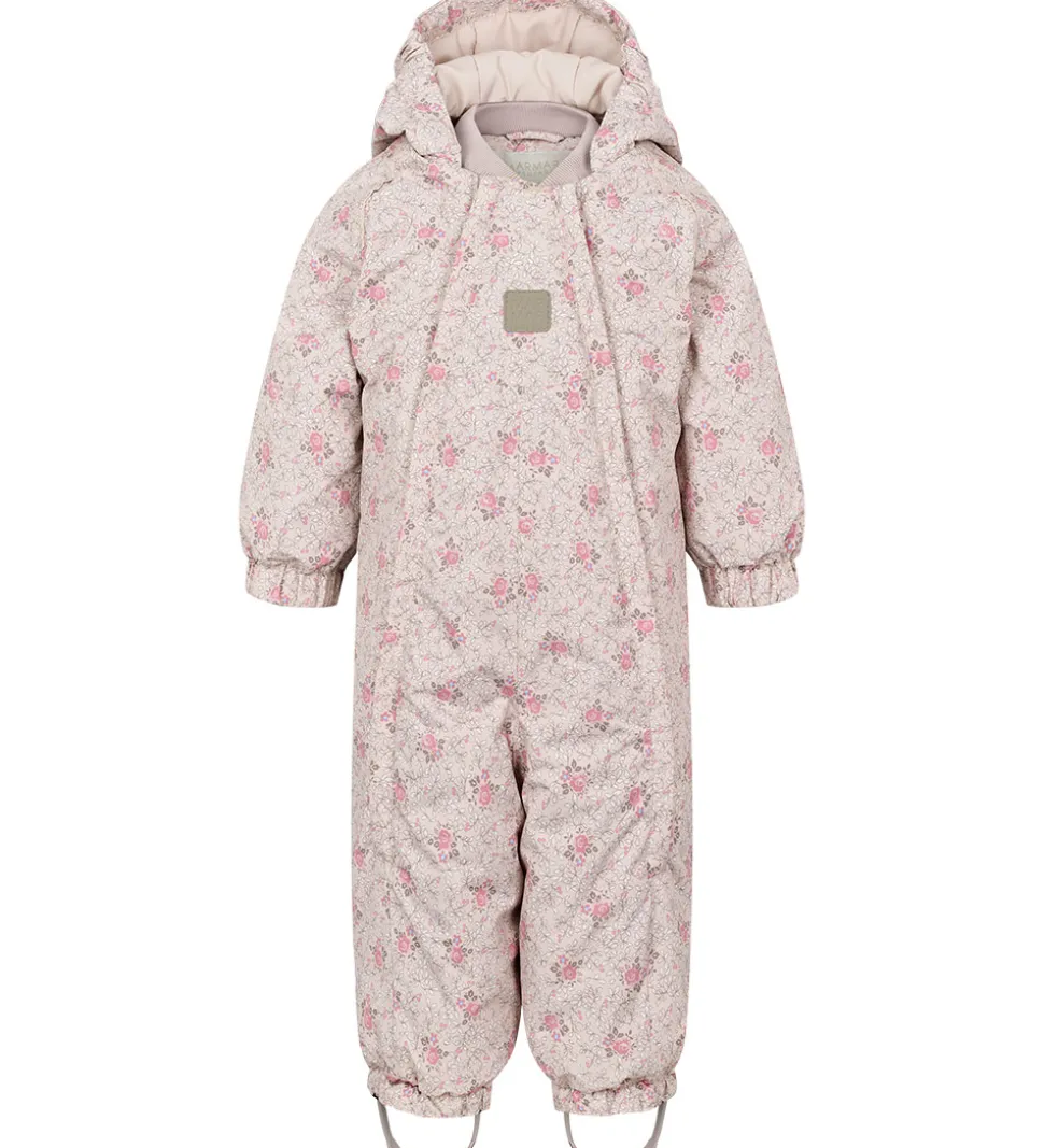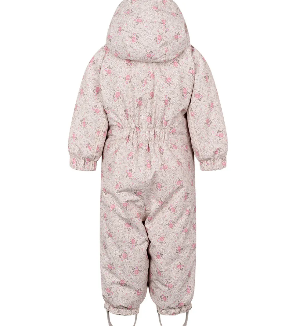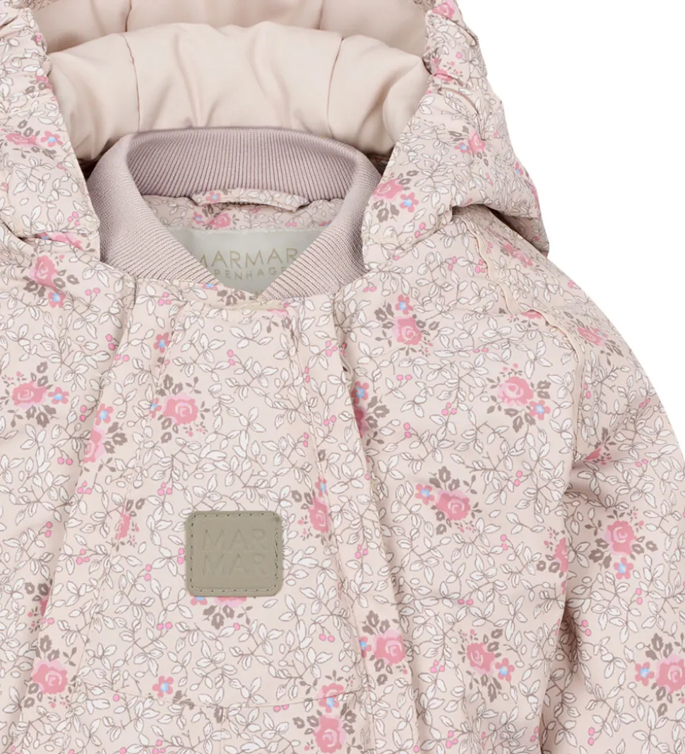 Flot MarMar flyverdragt i lys rosa med et alloverprint af blomster og blade i rosa, hvide og brune nuancer med blå detaljer. Flyverdragten har praktiske refleksdetaljer.